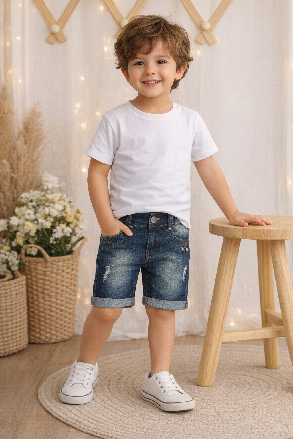 Bermuda jeans infantil masculina da marca LM Jeans Wear, confeccionada em jeans de alta qualidade, com toque macio e confortável. Modelo tradicional com fechamento em botão, passantes para cinto, bolsos frontais e traseiros funcionais. Possui lavagem moderna em tom azul médio com leves efeitos estonados e detalhes discretos que deixam a peça ainda mais estilosa. A barra dobrada fixa garante um visual moderno e versátil, ideal para o dia a dia, passeios e ocasiões casuais. Peça resistente, confortável e perfeita para acompanhar o crescimento da criança com muito estilo.