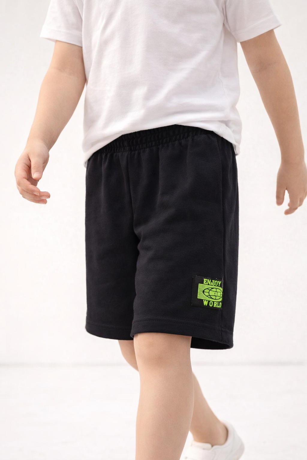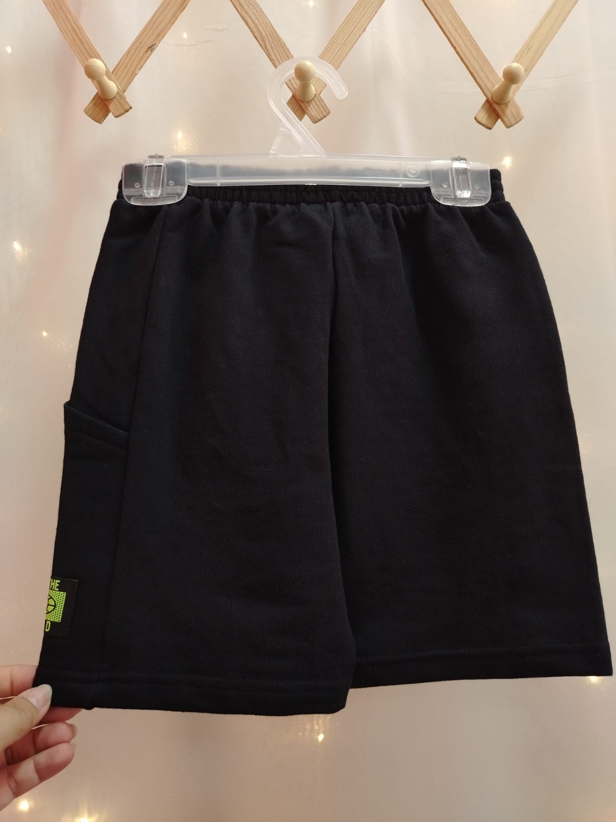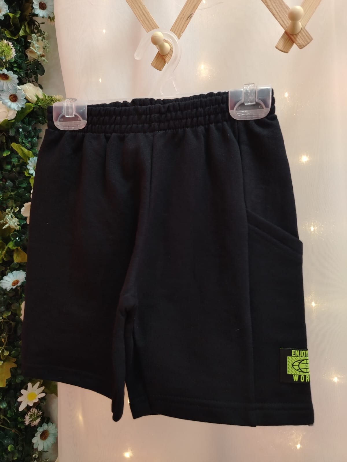 Bermuda infantil masculina na cor preta, confeccionada em 100% algodão, modelo básico e confortável para o dia a dia. Possui cós com elástico, caimento soltinho e bolso lateral funcional. Conta com detalhe aplicado na barra com etiqueta decorativa em verde, trazendo um toque moderno à peça. Ideal para compor looks casuais infantis com conforto e praticidade. Tamanho 8 anos.