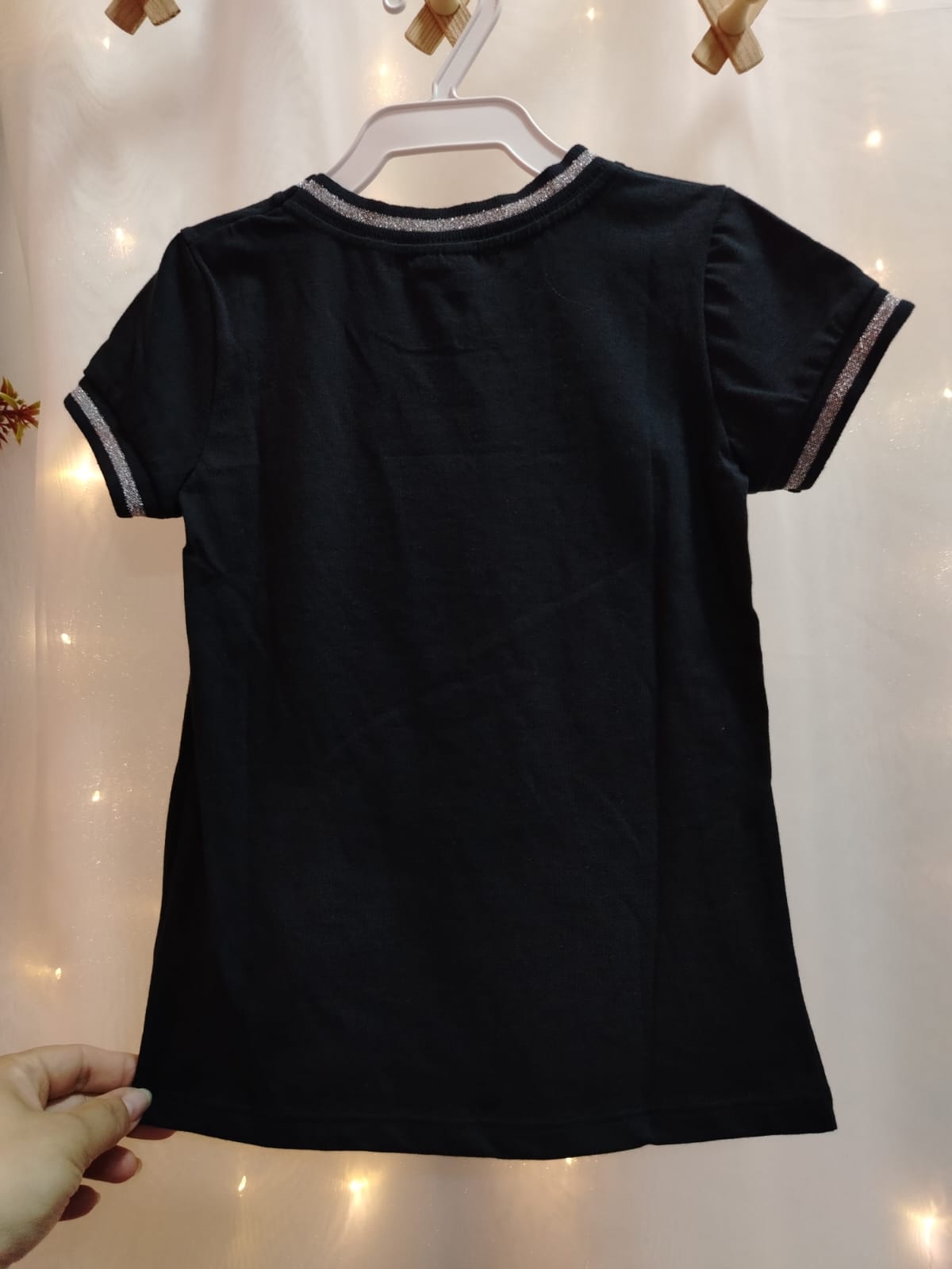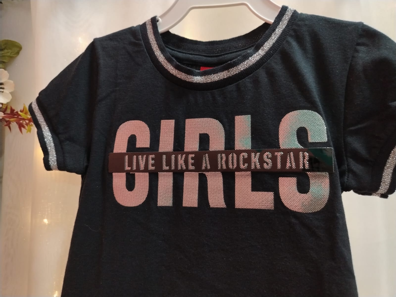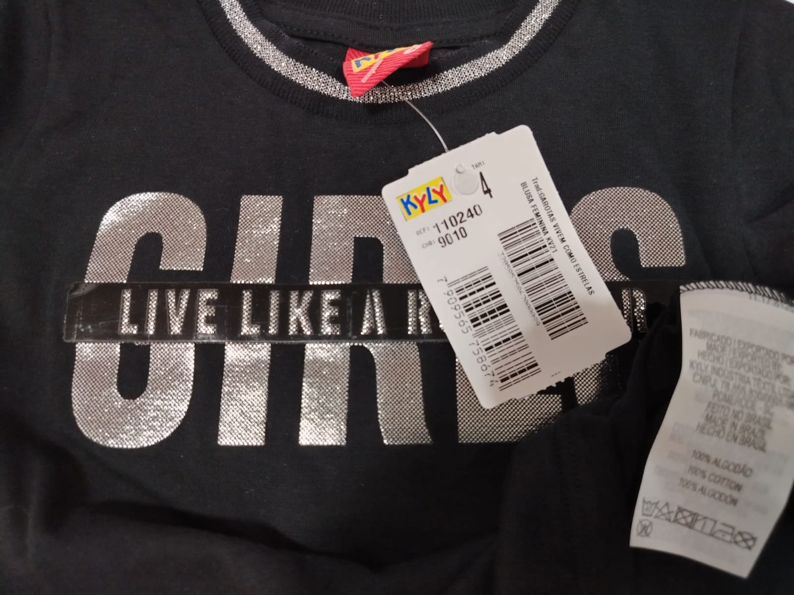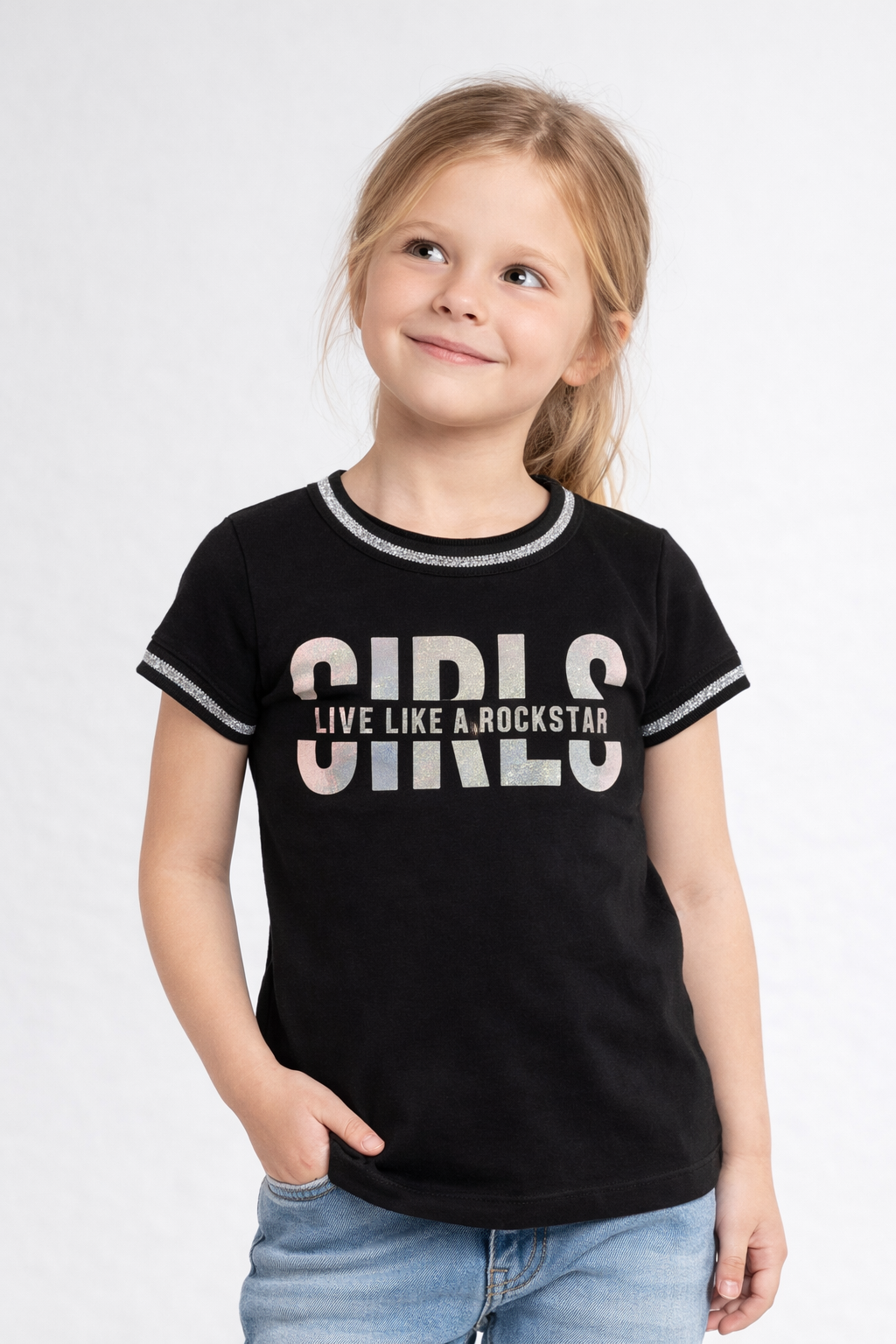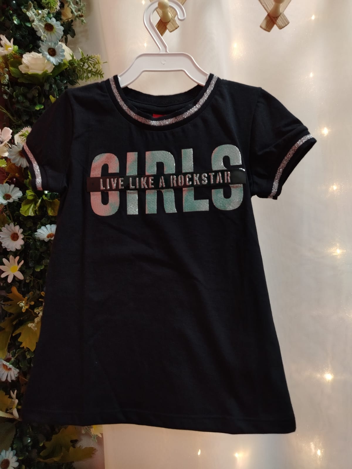 Blusa infantil feminina em malha 100% algodão, na cor preta, com estampa frontal moderna com a palavra “GIRLS” em destaque metalizado e frase “Live like a rockstar”. Possui acabamento com detalhe brilhante na gola e nas mangas, trazendo um toque estiloso e diferenciado à peça. Modelagem confortável, ideal para o dia a dia ou ocasiões casuais. Tamanho 4 anos.
