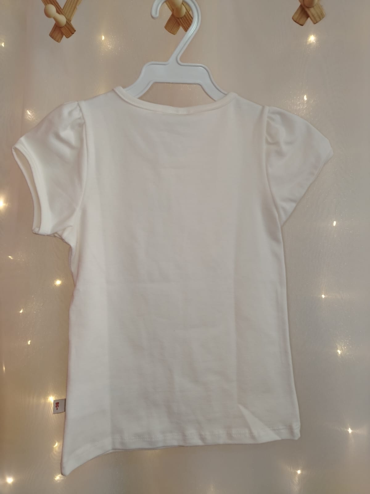 Cor off white, modelo de manguinha levemente bufante e gola redonda.