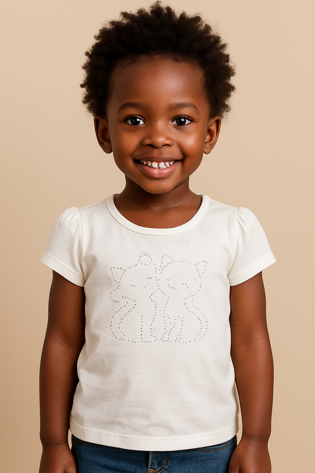 A frente possui desenho de gatinhos formado por apliques de strass, delicado e brilhante, garantindo um toque elegante e fofo para diversas ocasiões.