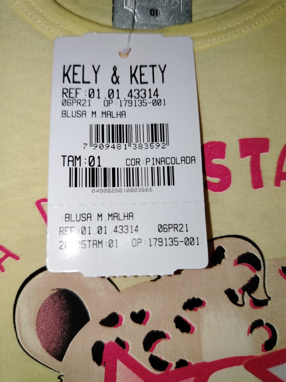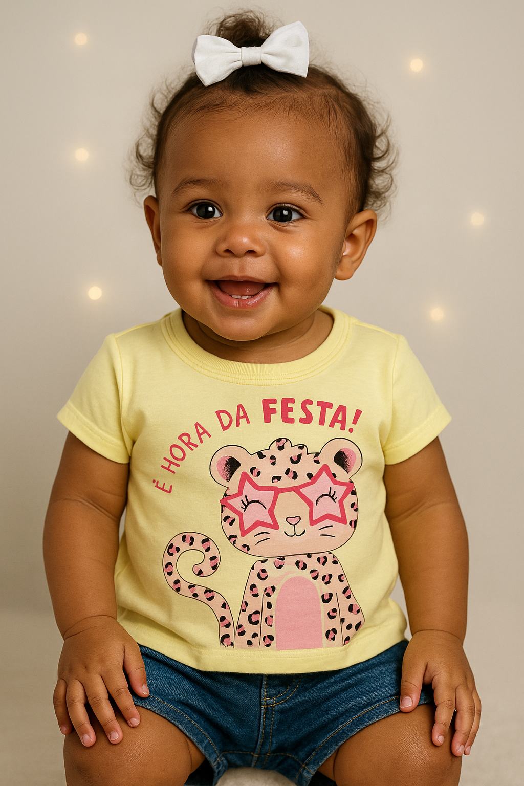 A Blusa Infantil Kely & Kety “É Hora da Festa!” é divertida e cheia de charme!Confeccionada em malha 100% algodão, possui toque suave, ideal para o conforto das pequenas.Na cor amarela Piña Colada, traz estampa exclusiva de uma onça estilizada com óculos em forma de estrela e a frase “É hora da festa!” em rosa vibrante.Modelo com mangas curtas, leve e confortável — perfeita para o dia a dia ou passeios em dias quentes. Composição:100% Algodão Cor: Amarelo claro (Piña Colada)Gênero: MeninaTamanho: 1 (12 a 18 meses)Fabricado no Brasil