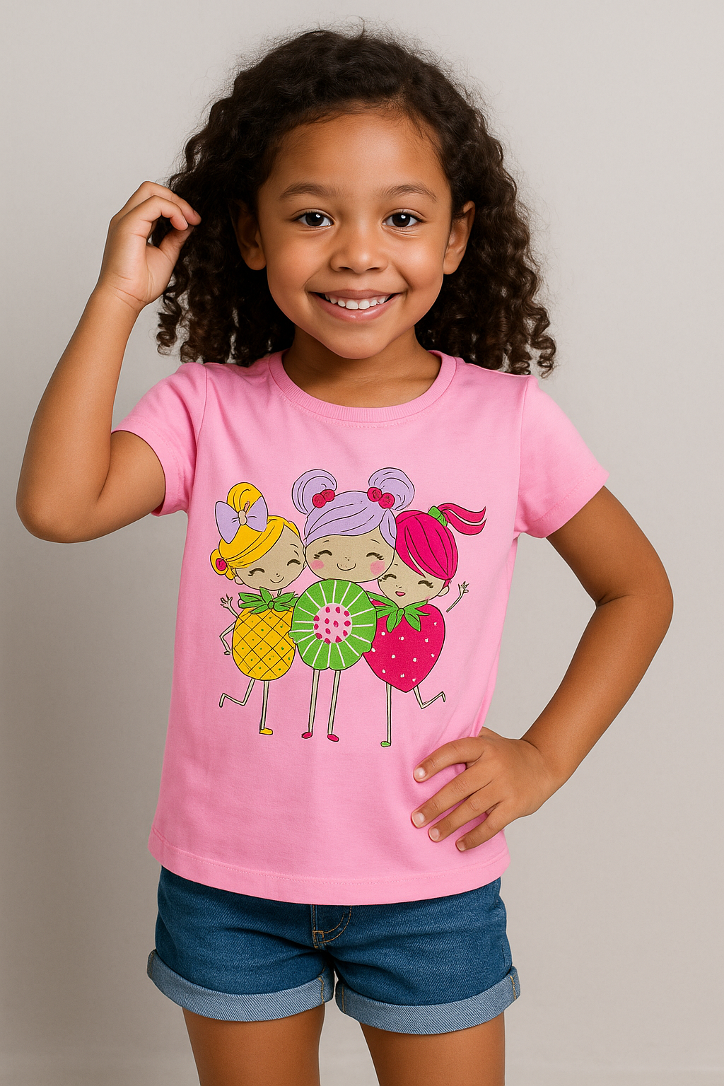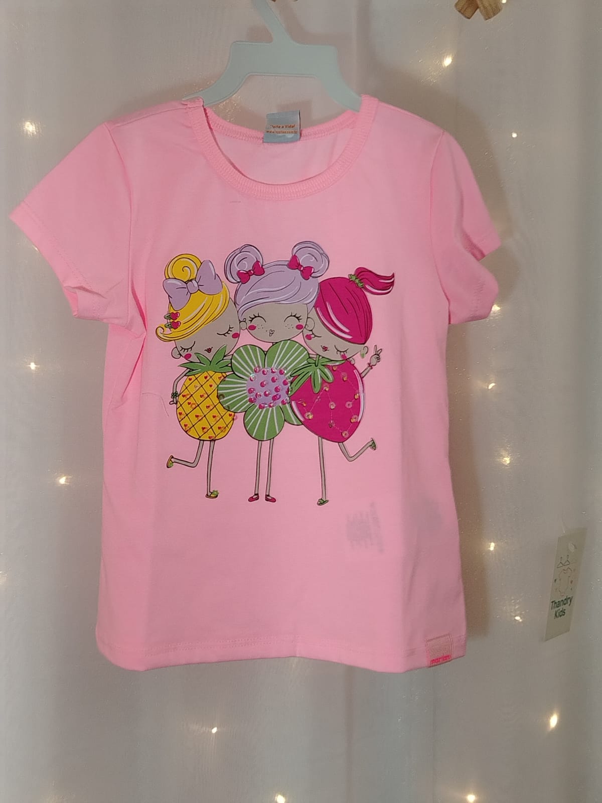 Cor rosa vanilla, com estampa exclusiva de três personagens fantasia de frutas (abacaxi, kiwi e morango), super divertida e colorida.