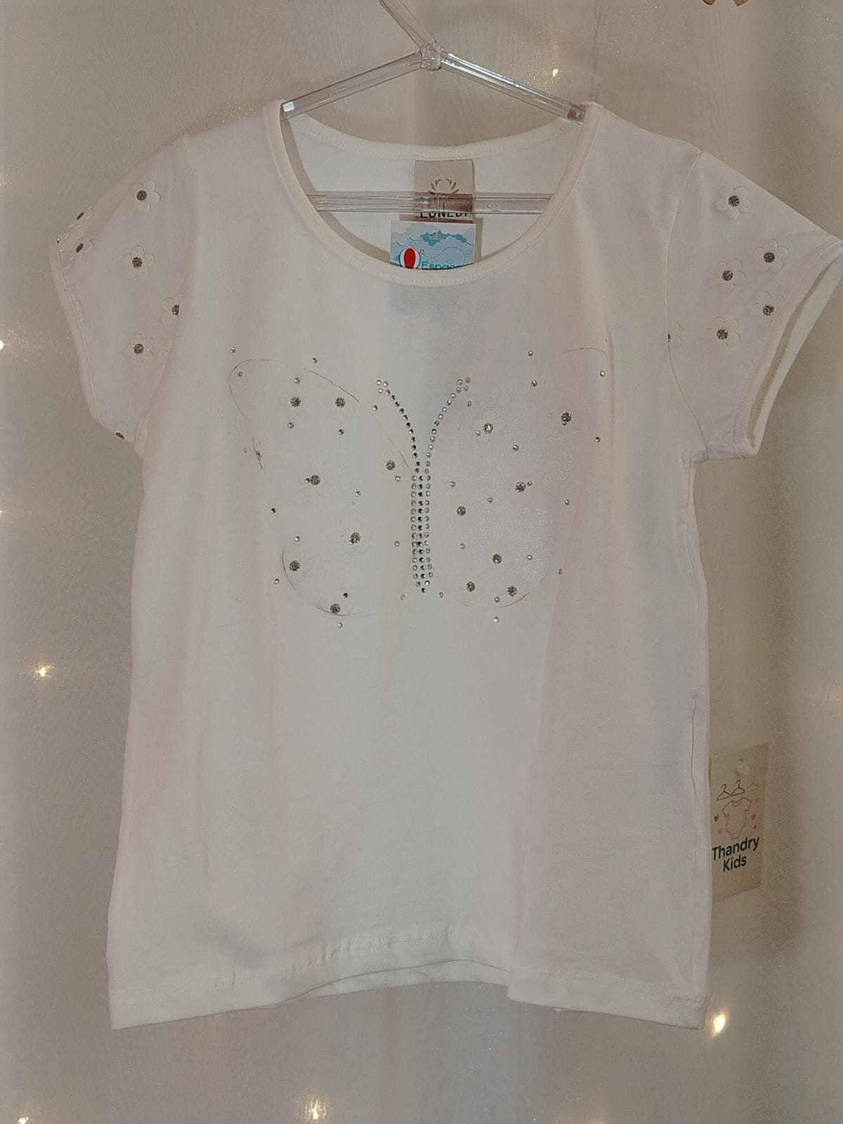 Possui linda estampa frontal de borboleta com aplicações de strass e glitter, que trazem brilho e delicadeza ao visual.