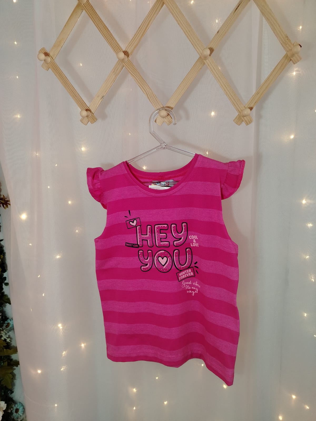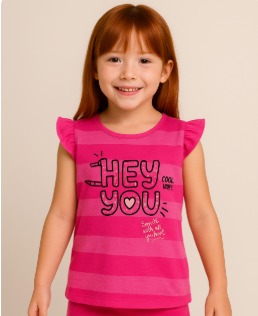 Possui estampa frontal com frase “HEY YOU”, detalhes em strass brilhante e babadinhos delicados nas mangas, trazendo charme e estilo para o look das meninas.