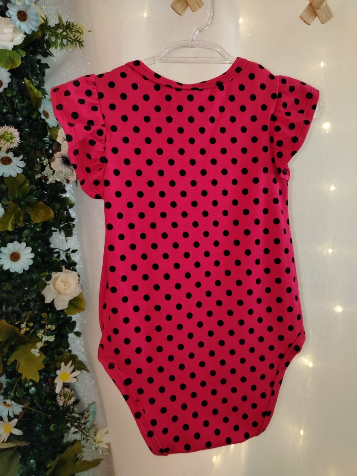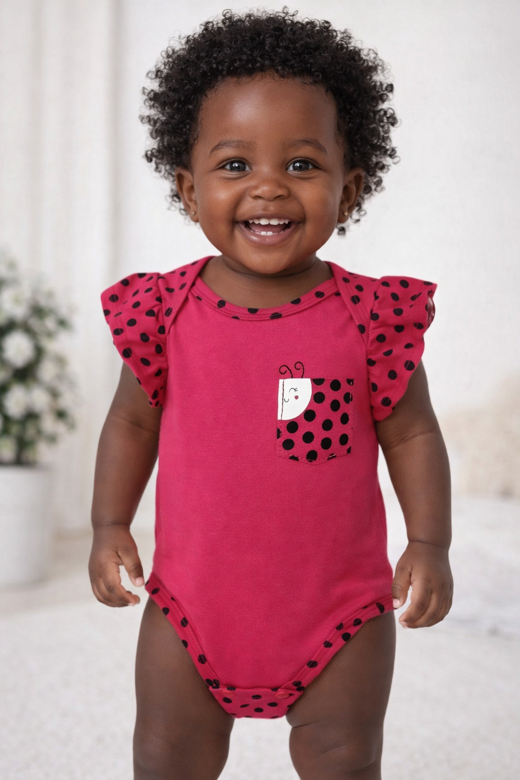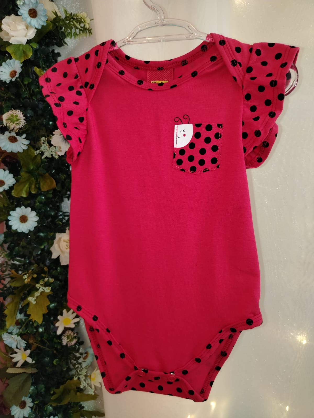 Body infantil feminino Kyly confeccionado em malha macia, composto por 95% algodão e 5% elastano, proporcionando conforto, leve elasticidade e toque suave à pele do bebê. Modelo na cor rosa vibrante com estampa de poás pretos, mangas curtas com babadinhos delicados e acabamento reforçado. Possui gola redonda, abertura inferior com botões de pressão para facilitar a troca e bolsinho frontal decorativo com aplicação de joaninha, trazendo charme e um visual alegre à peça. Ideal para uso diário, garantindo conforto e liberdade de movimentos.