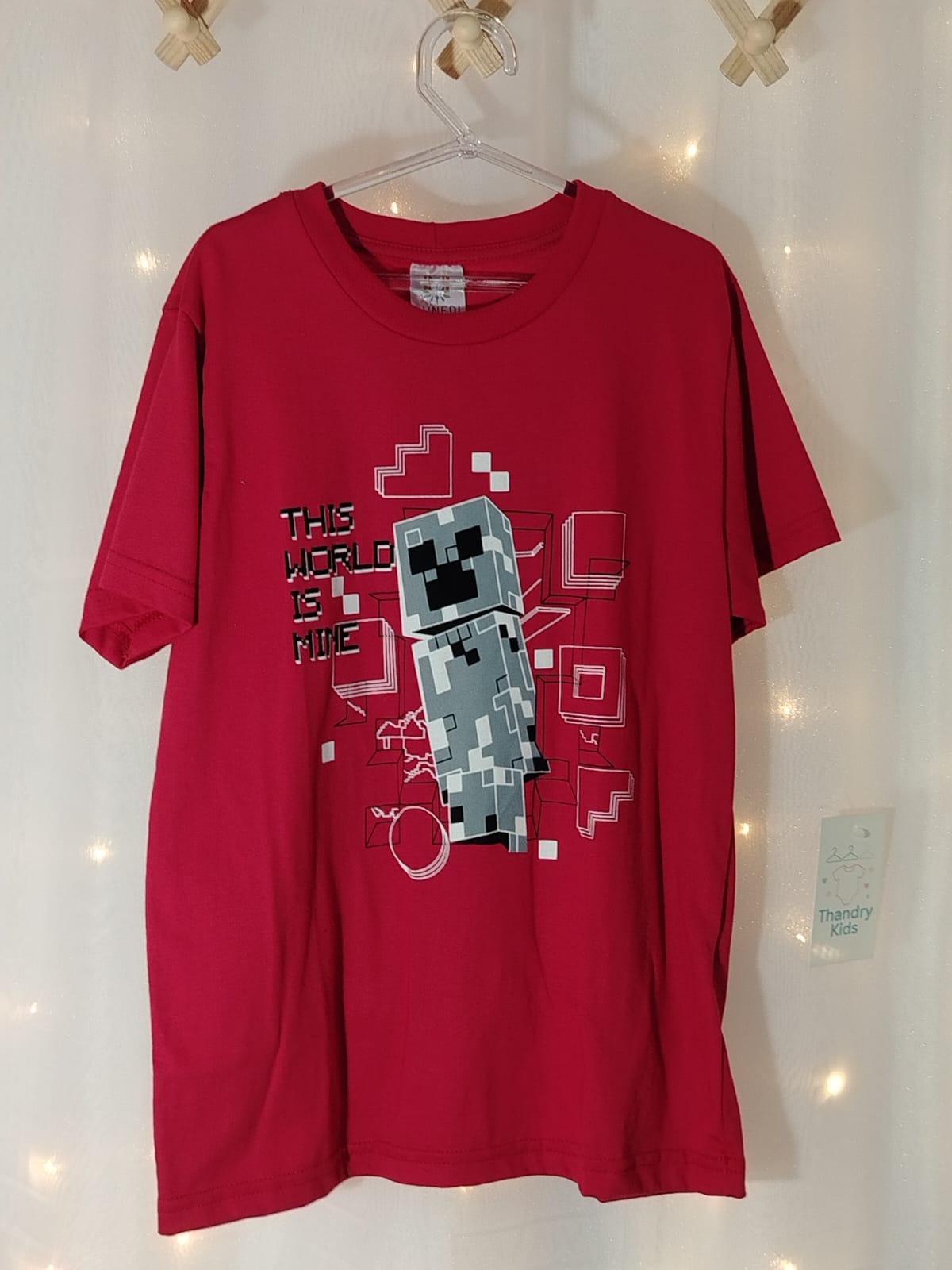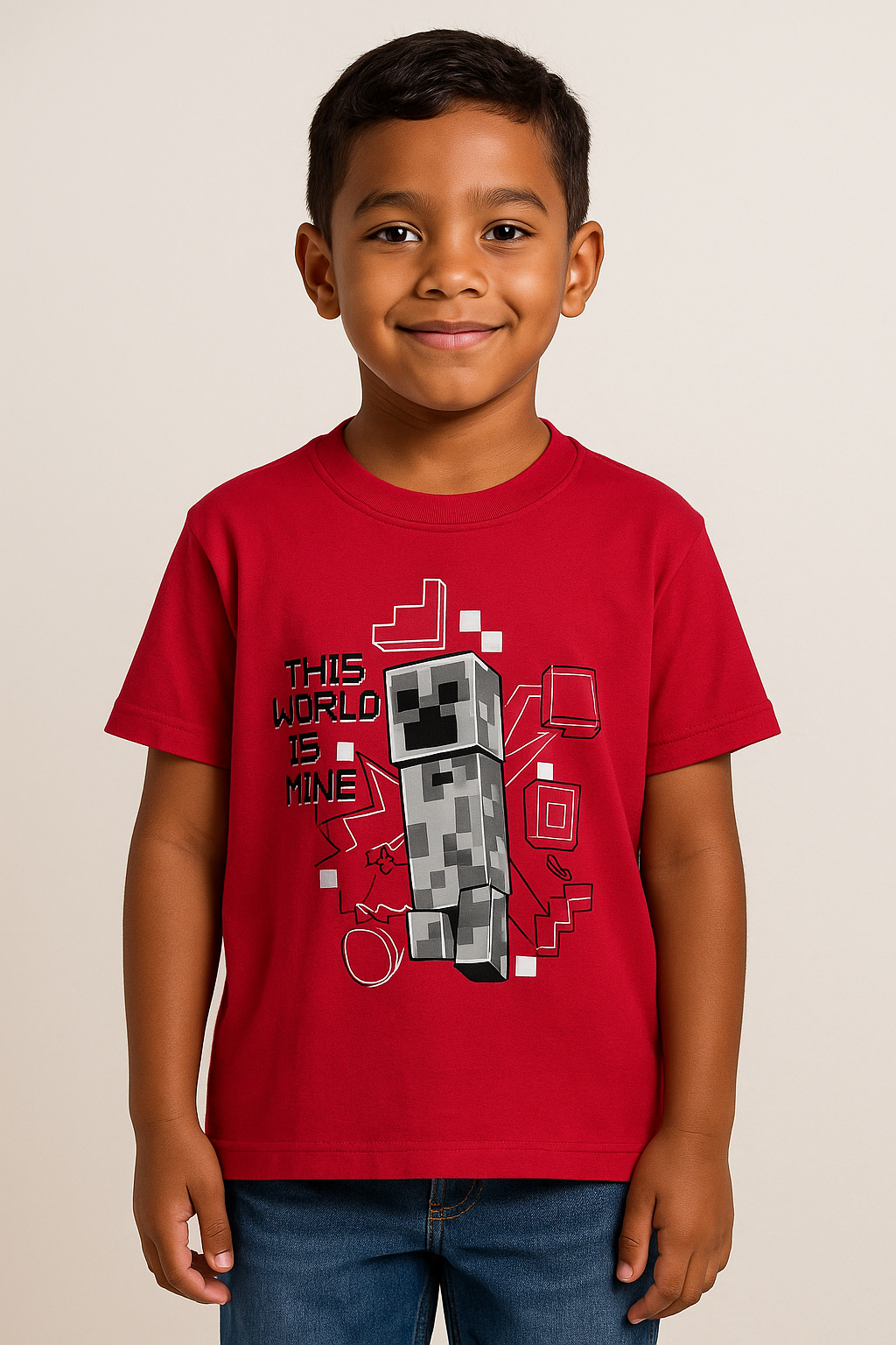 Camiseta infantil Lunedi confeccionada em 100% algodão, na cor vermelha, com estampa moderna inspirada em blocos e games, trazendo a frase “This world is mine”. A peça é super confortável, com toque macio e caimento leve, ideal para o dia a dia das crianças.