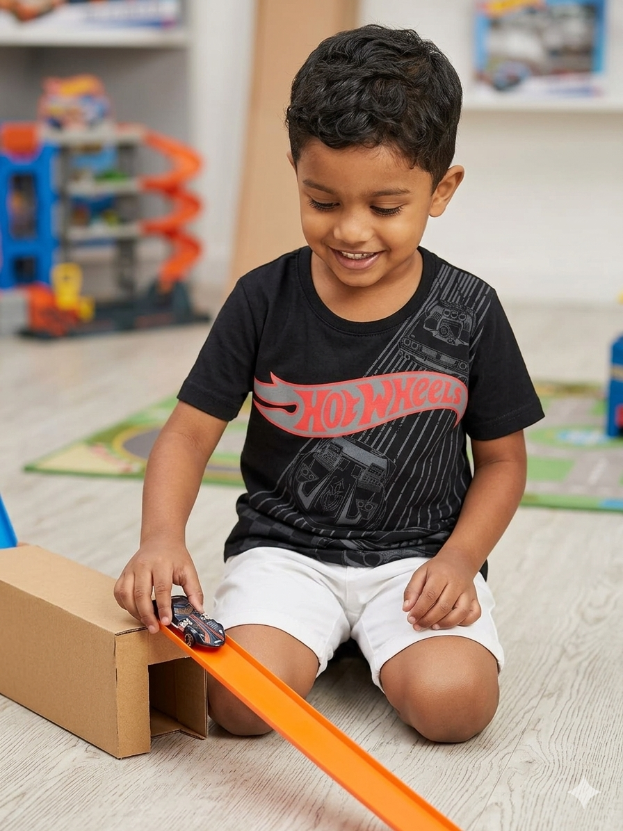 Camiseta infantil masculina Hot Wheels na cor preta, confeccionada em 100% algodão, proporcionando conforto, maciez e ótima respirabilidade para o uso diário. Modelo com gola redonda e mangas curtas. A peça possui estampa frontal com o logo clássico Hot Wheels em destaque, acompanhado de ilustrações de carros em estilo urbano, trazendo um visual moderno e cheio de atitude. Ideal para crianças que gostam de carros e velocidade, perfeita para compor looks casuais com muito estilo.