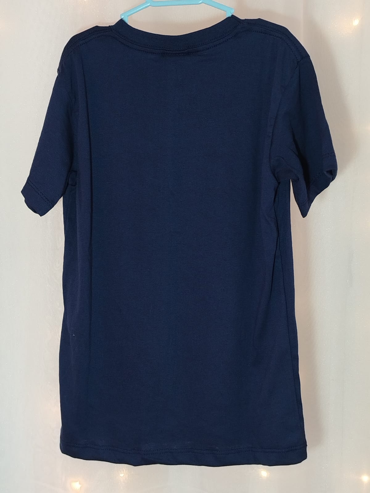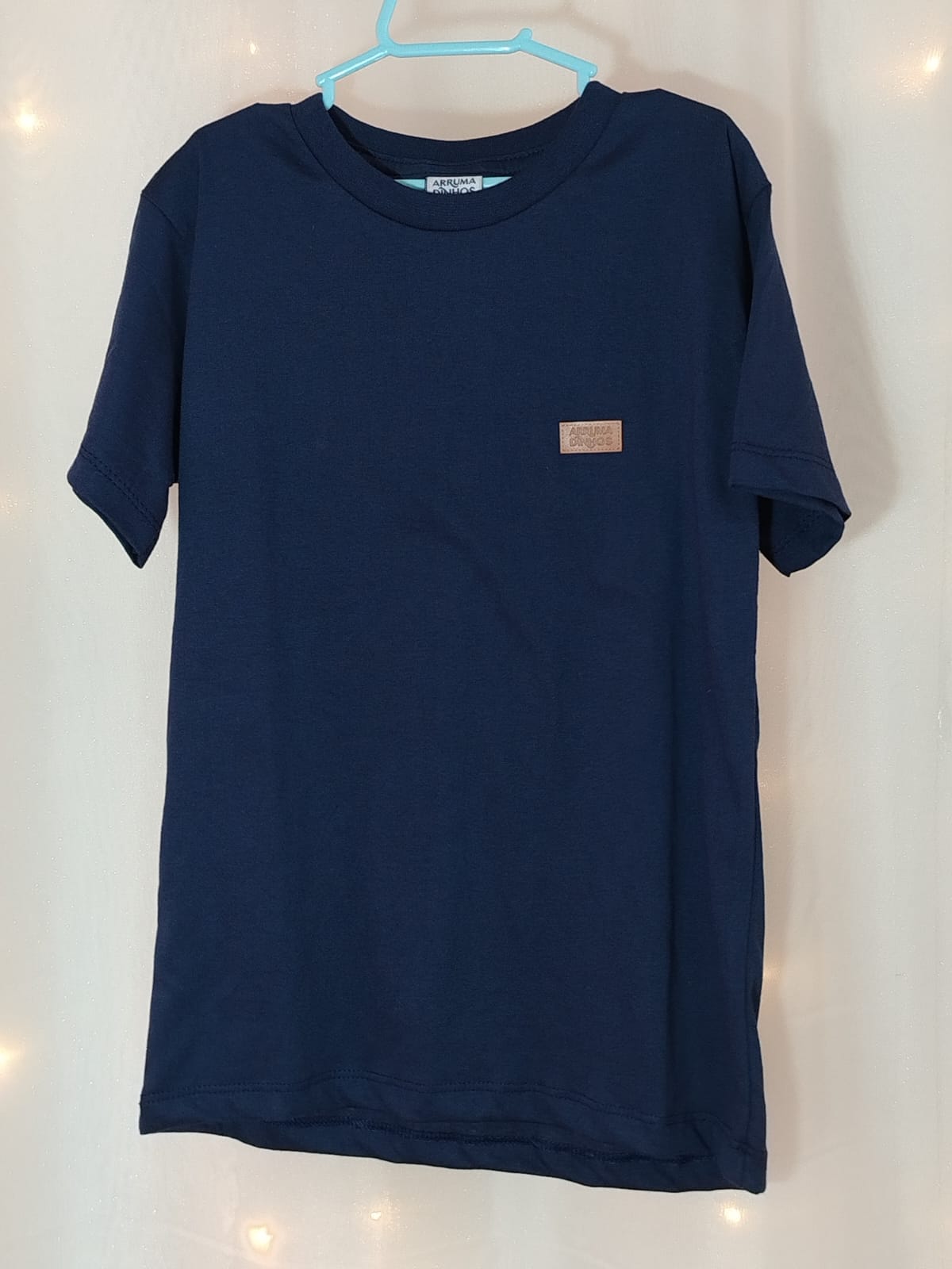 Na cor azul marinho, possui modelagem tradicional com gola redonda e manga curta.