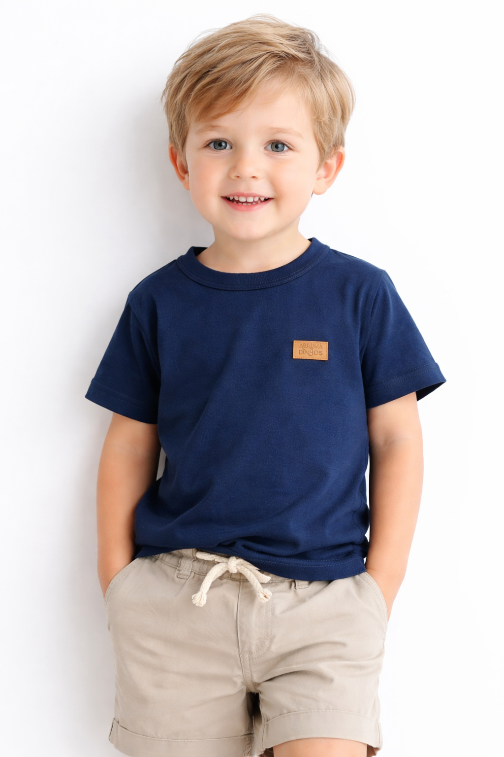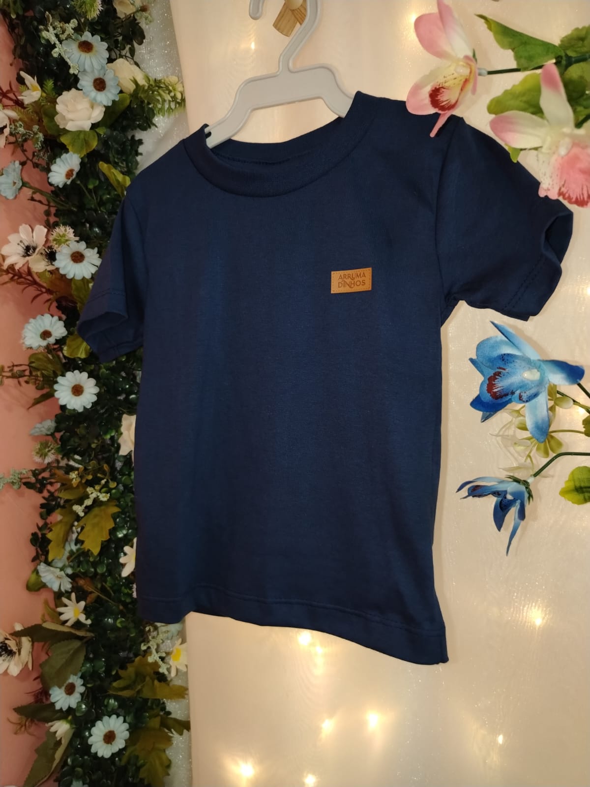 Modelo básico na cor azul marinho, com aplique frontal da marca em detalhe marrom, gola redonda e mangas curtas.