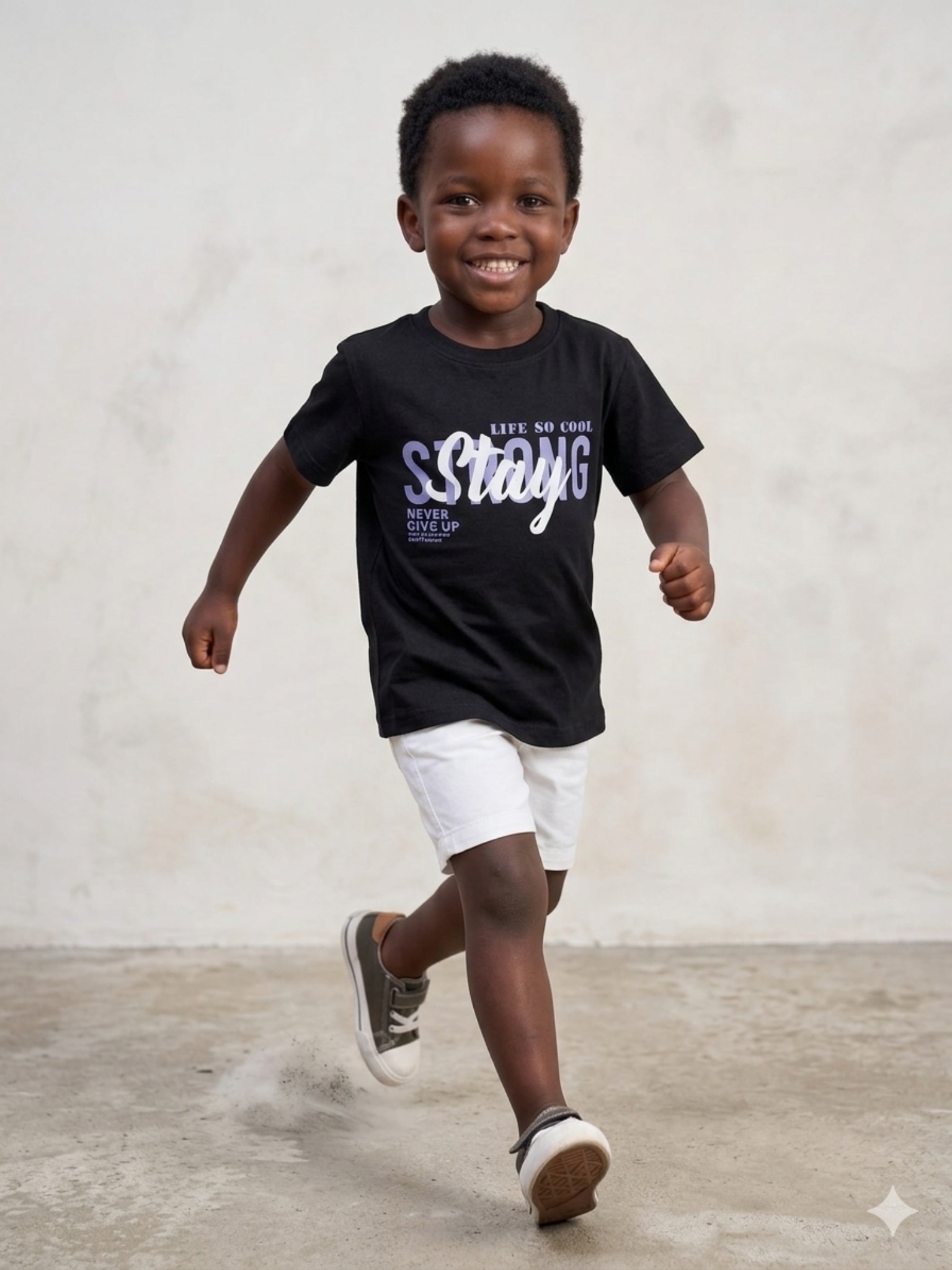 Camiseta infantil masculina em meia malha, cor preto, estampa frontal Stay Strong com detalhes em branco e azul,