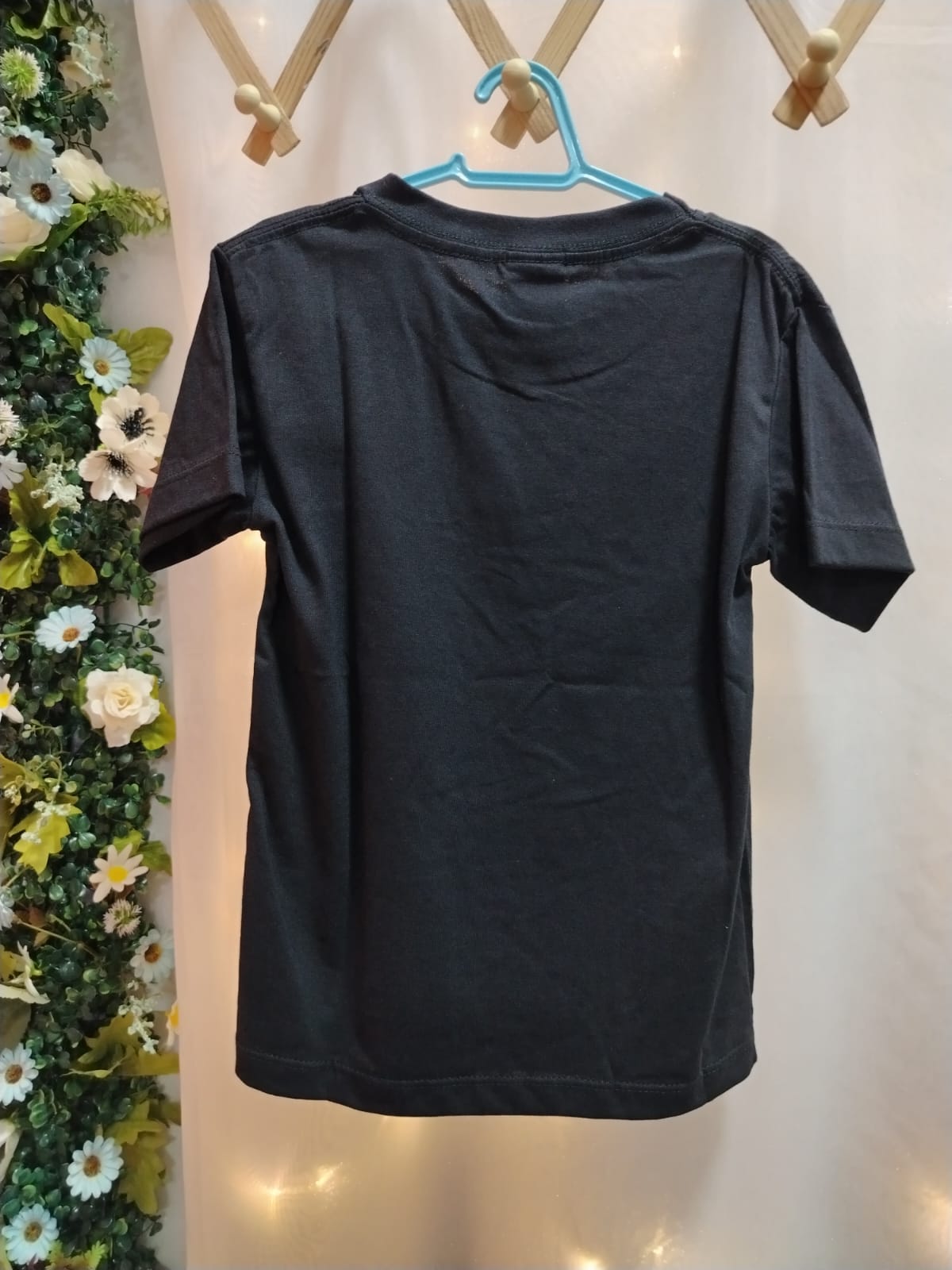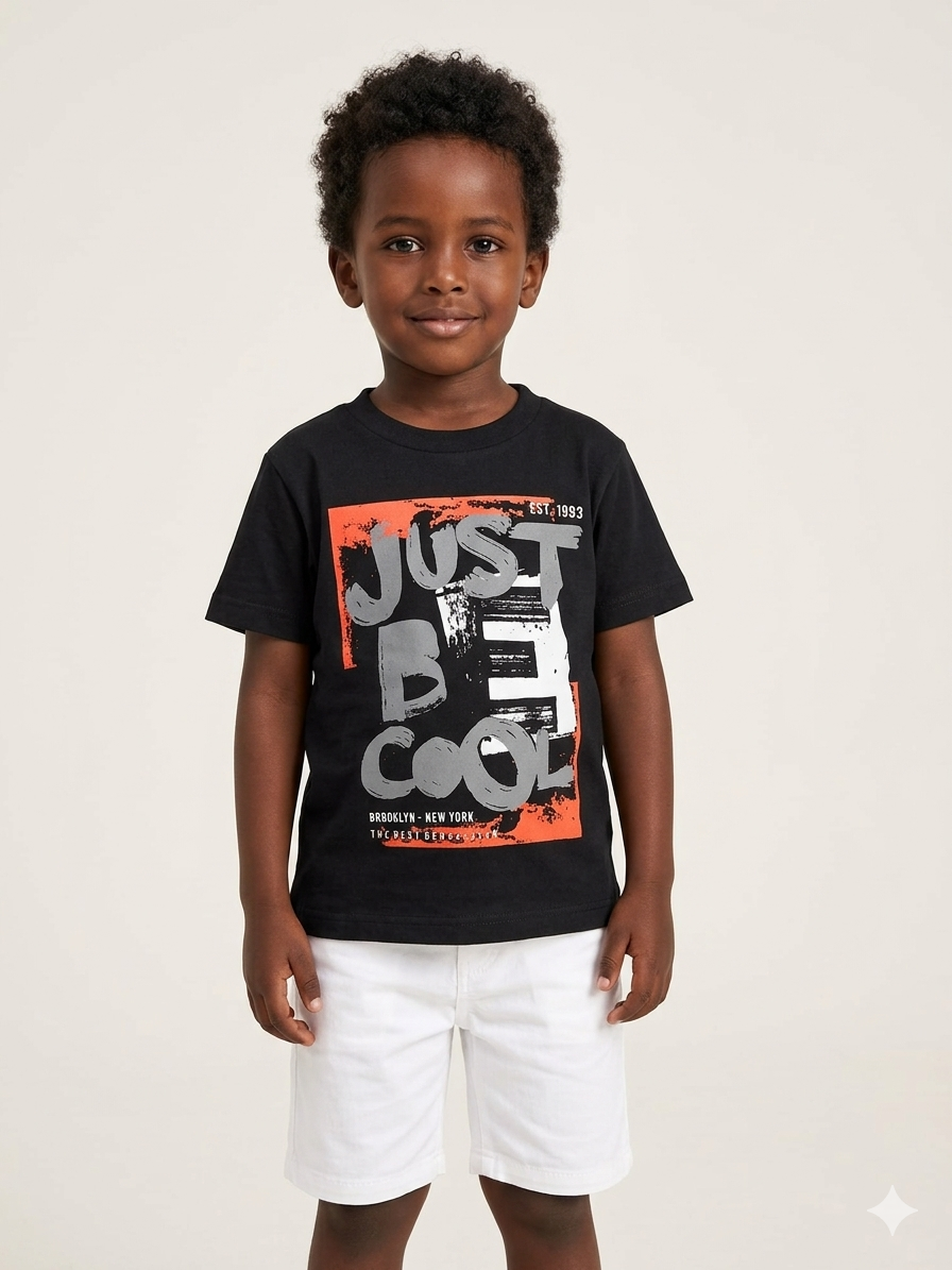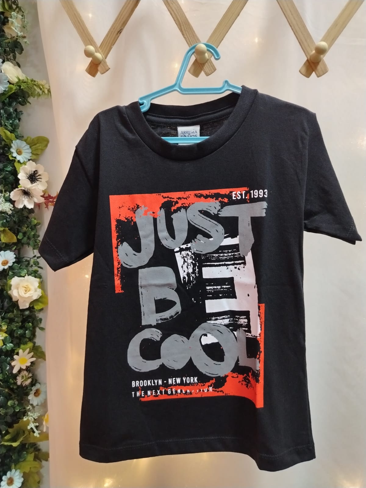 Camiseta infantil masculina em meia malha, cor preto, estampa frontal “Just Be Cool” com detalhes em preto, branco e vermelho.