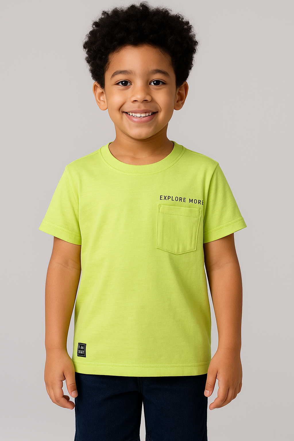 Modelo com bolsinho frontal e estampa minimalista “EXPLORE MORE”, ideal para o dia a dia dos meninos.