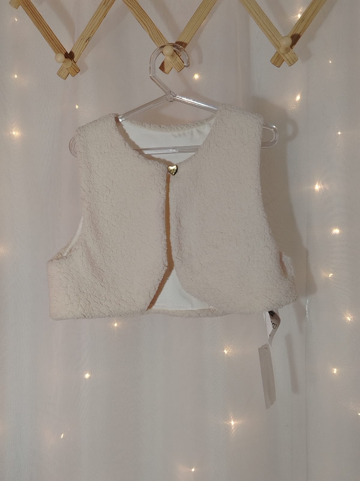 Colete infantil feminino em tom off white, confeccionado em tecido peluciado macio e aconchegante, ideal para os dias mais frios. Possui fechamento frontal com botão dourado em formato de coração, e forro interno liso, garantindo conforto e charme ao visual.