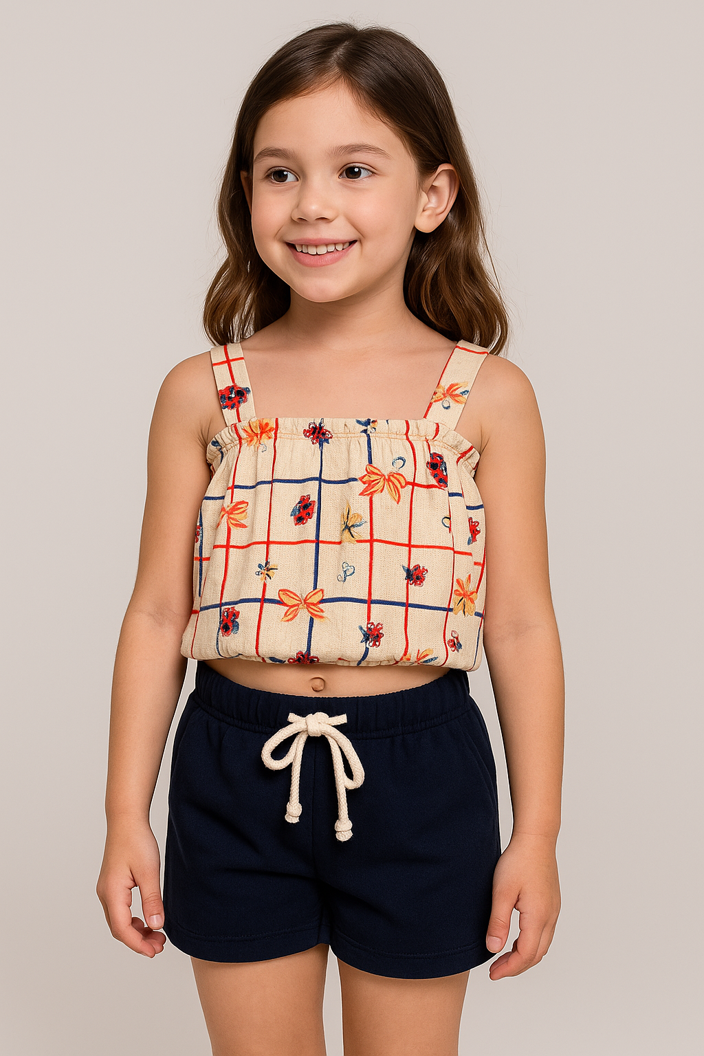 A blusa possui estampa delicada em tons areia, com detalhes em laços, flores e linhas coloridas, além de alças largas e elástico embutido que garante ótimo caimento e conforto.