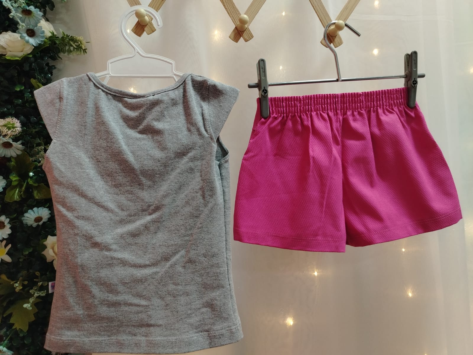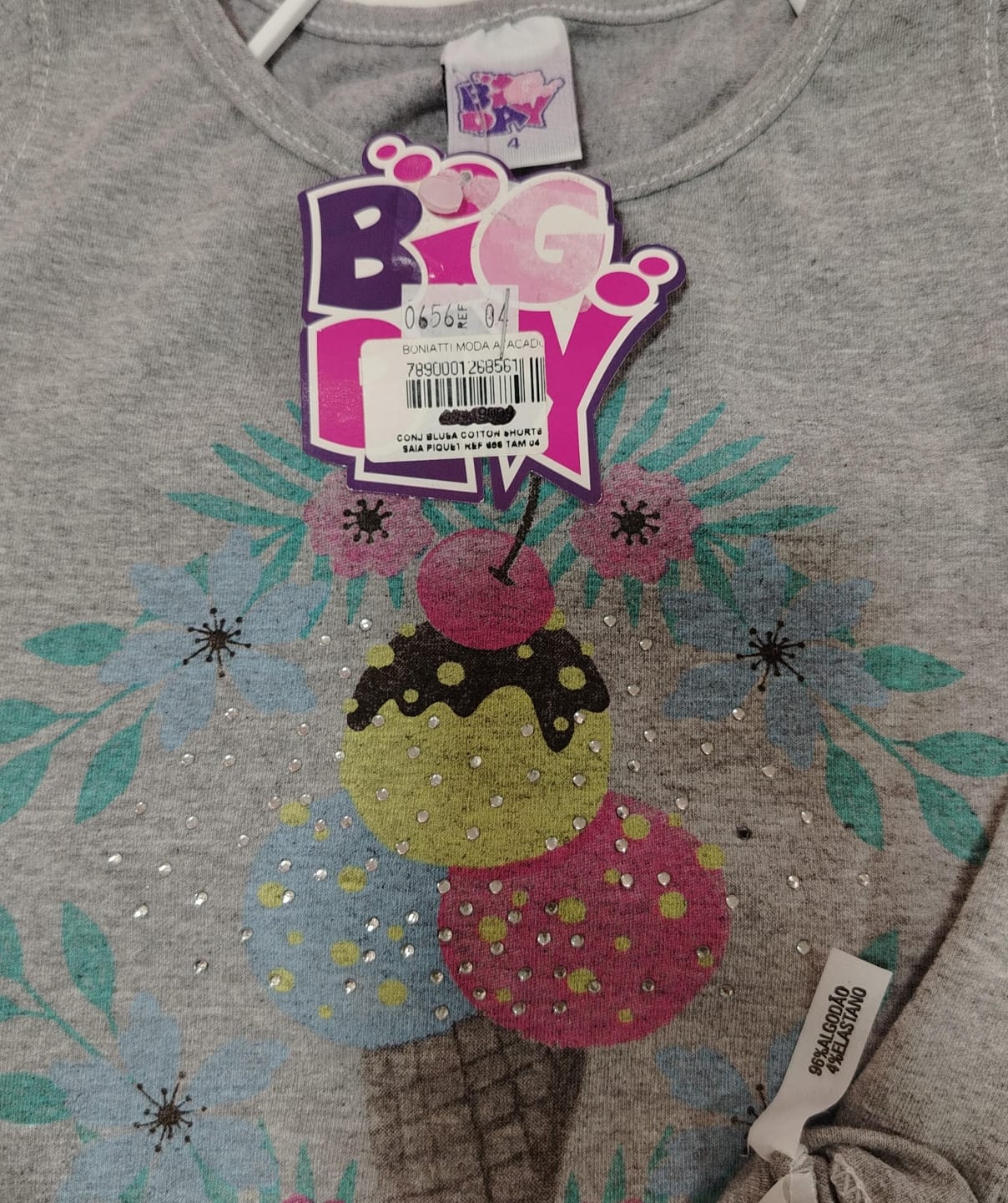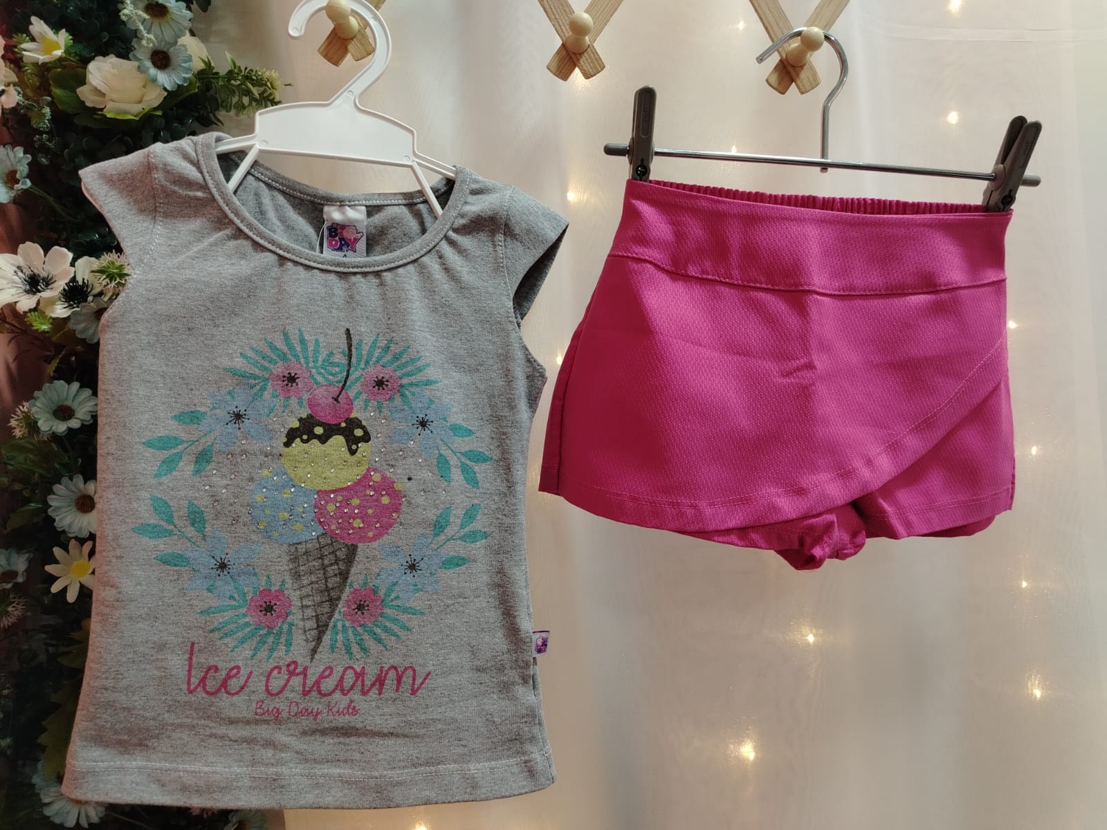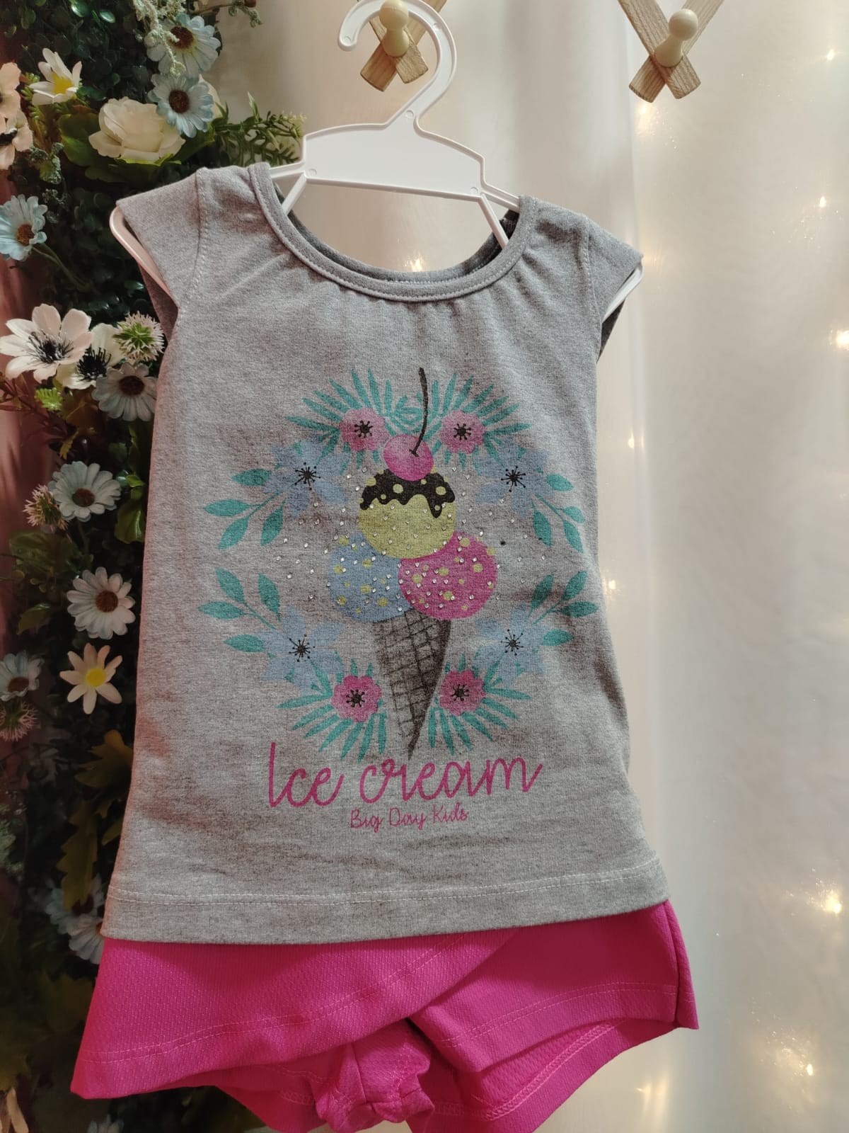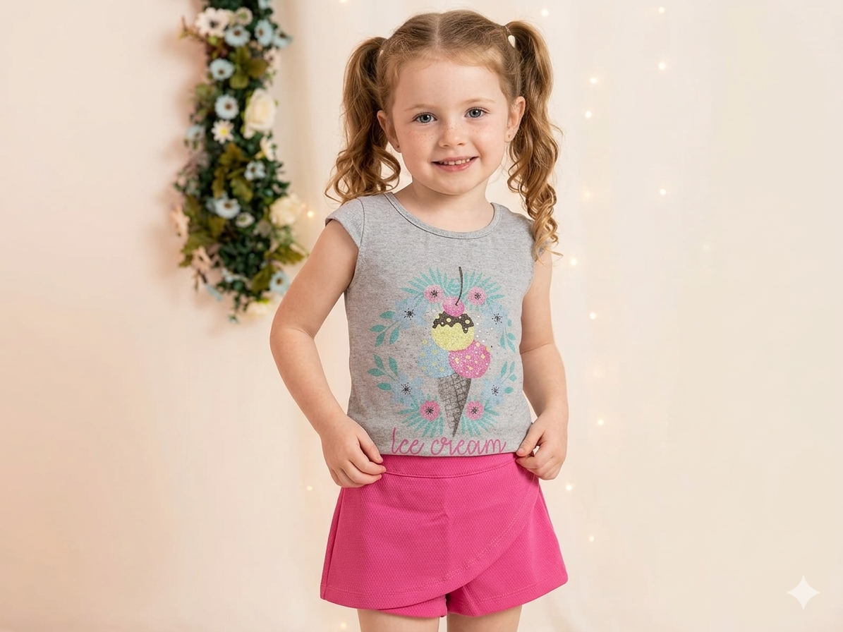 Conjunto infantil feminino composto por blusa em cotton na cor mescla, com manga curta e gola redonda. A peça possui estampa frontal “Ice Cream” com desenho de sorvete, flores e aplicações brilhantes. Acompanha short saia pink em piquet, com cós em elástico, confortável para o uso diário. Tamanho 4 anos. Referência 0656. Composição do short saia: 67% algodão, 27% poliéster e 6% elastano.