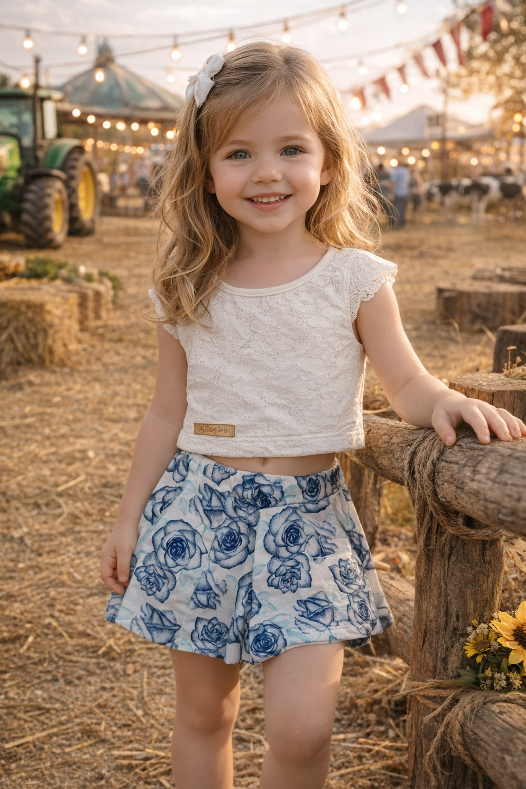Conjunto infantil feminino composto por blusa cropped em renda off white e shorts estampado floral em tons de azul. A blusa possui modelagem confortável, mangas curtas delicadas e acabamento em renda que traz elegância à peça. O shorts apresenta estampa floral moderna com cós confortável e caimento leve, proporcionando liberdade de movimento para a criança.