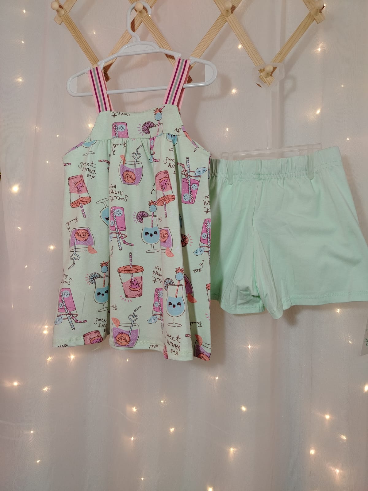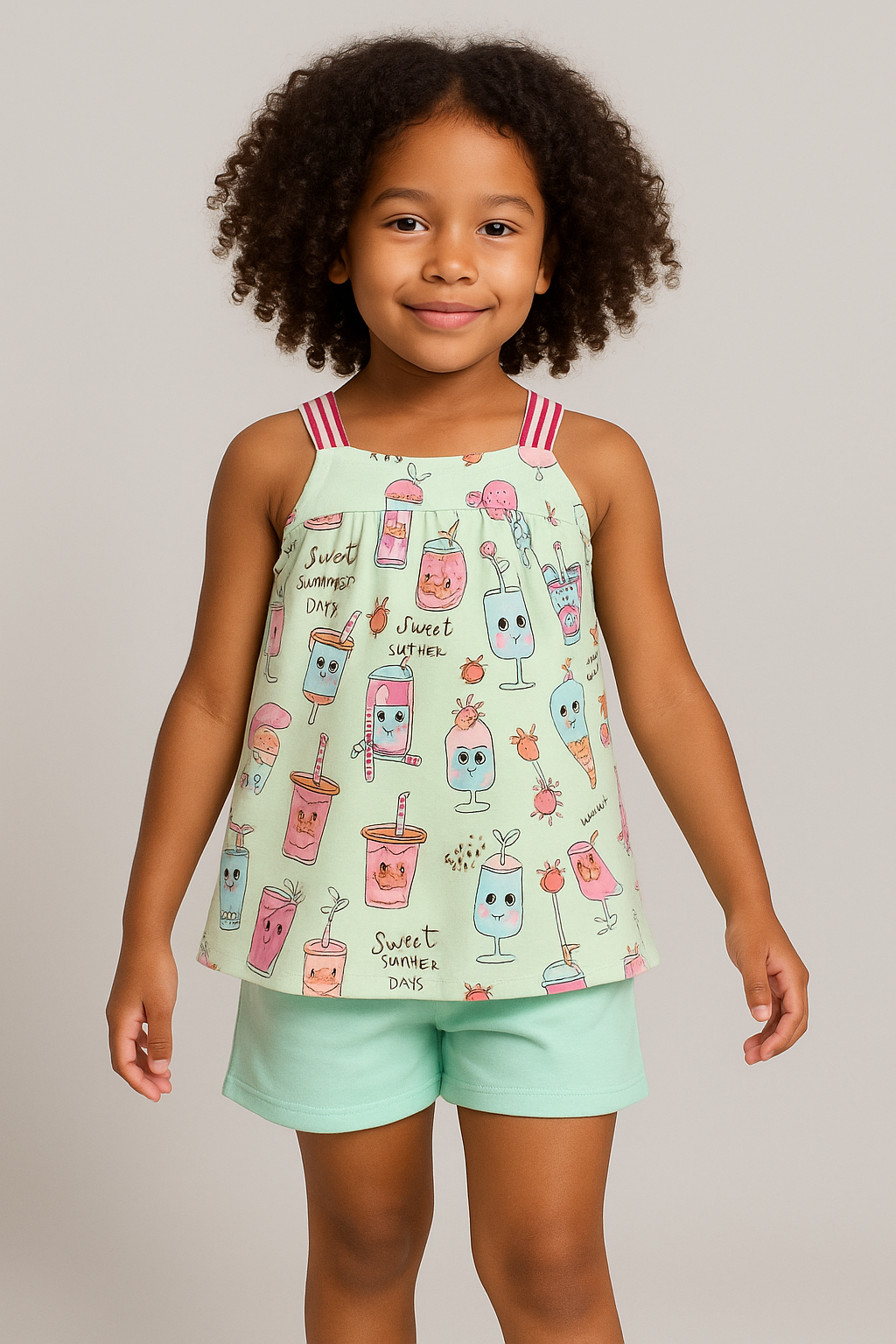 Composto por uma blusa soltinha com estampa divertida de copos e drinks coloridos “Sweet Summer Days”, e um short verde água em malha super macia, o conjunto é ideal para passeios, brincadeiras e momentos de lazer.