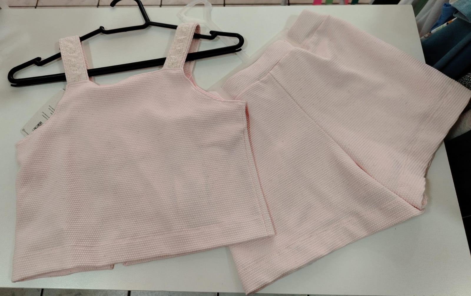 Blusa em tecido texturizado na cor rosa claro, com modelagem reta e alças mais largas com detalhe em renda, trazendo um charme especial à peça. Possui fechamento frontal com botões decorativos em formato de coração, que dão um toque elegante e diferenciado.