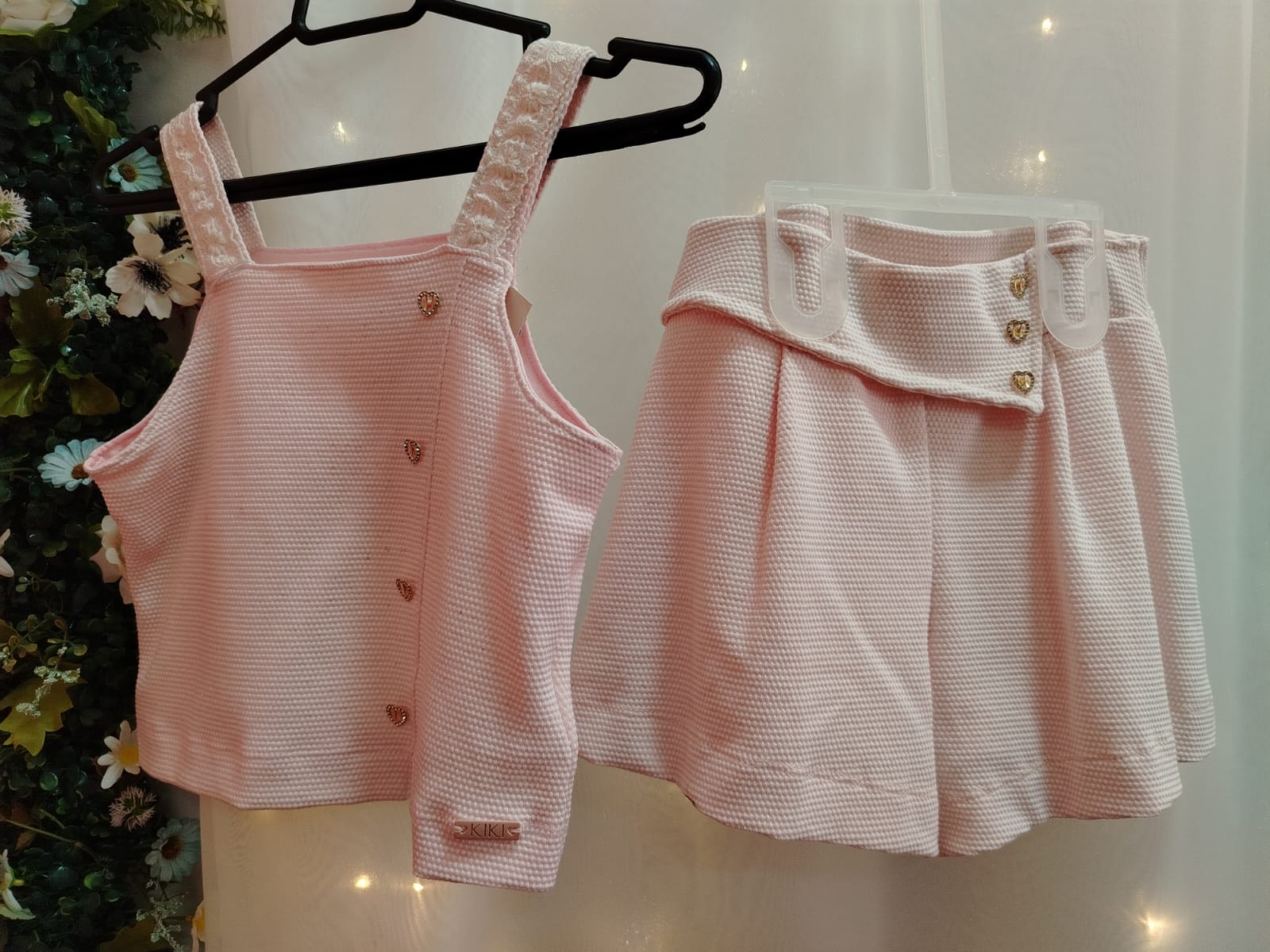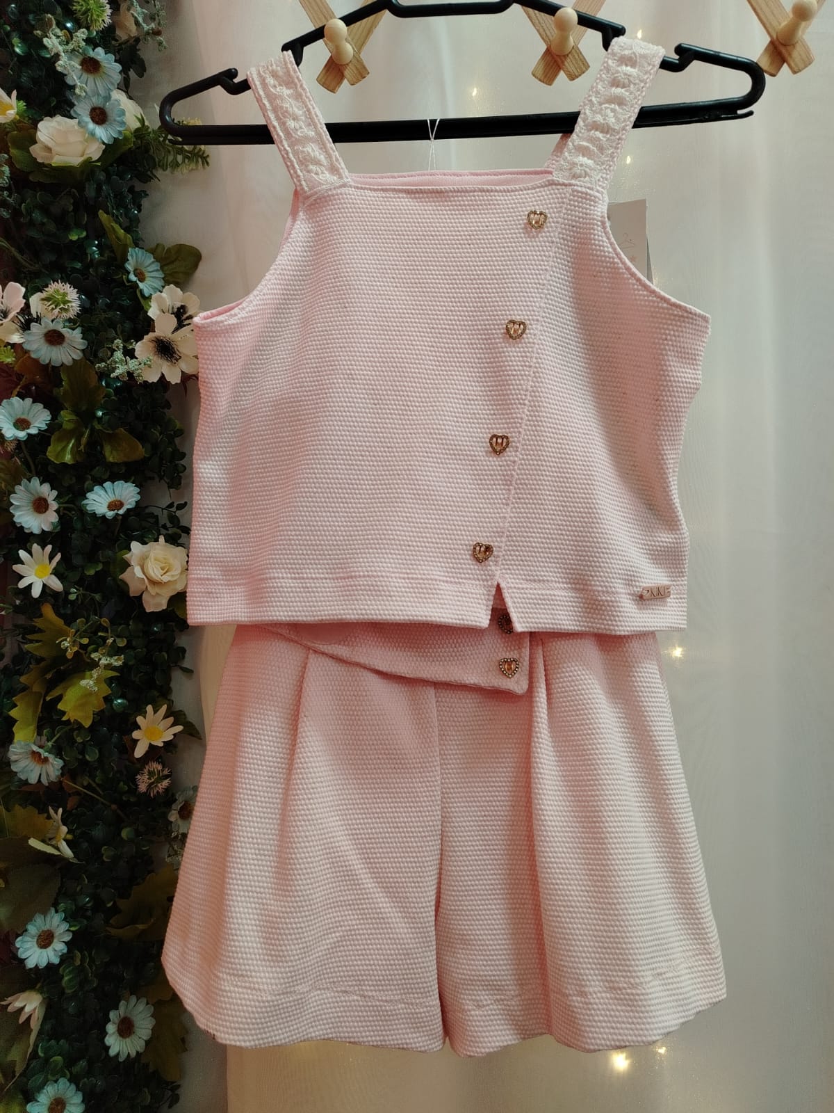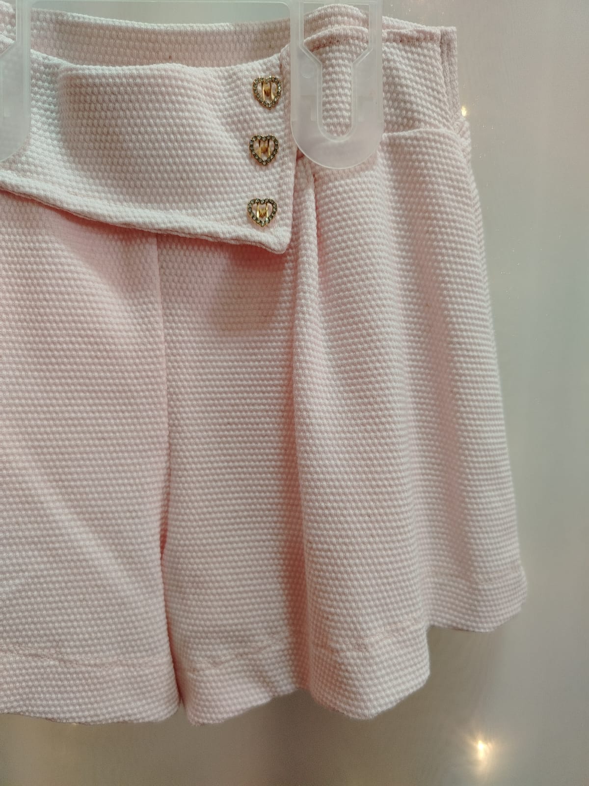 Short saia na mesma tonalidade, confeccionado em tecido encorpado e texturizado, com sobreposição frontal e detalhe de botões decorativos em formato de coração, mantendo harmonia com a blusa. Modelagem confortável que garante liberdade de movimento.