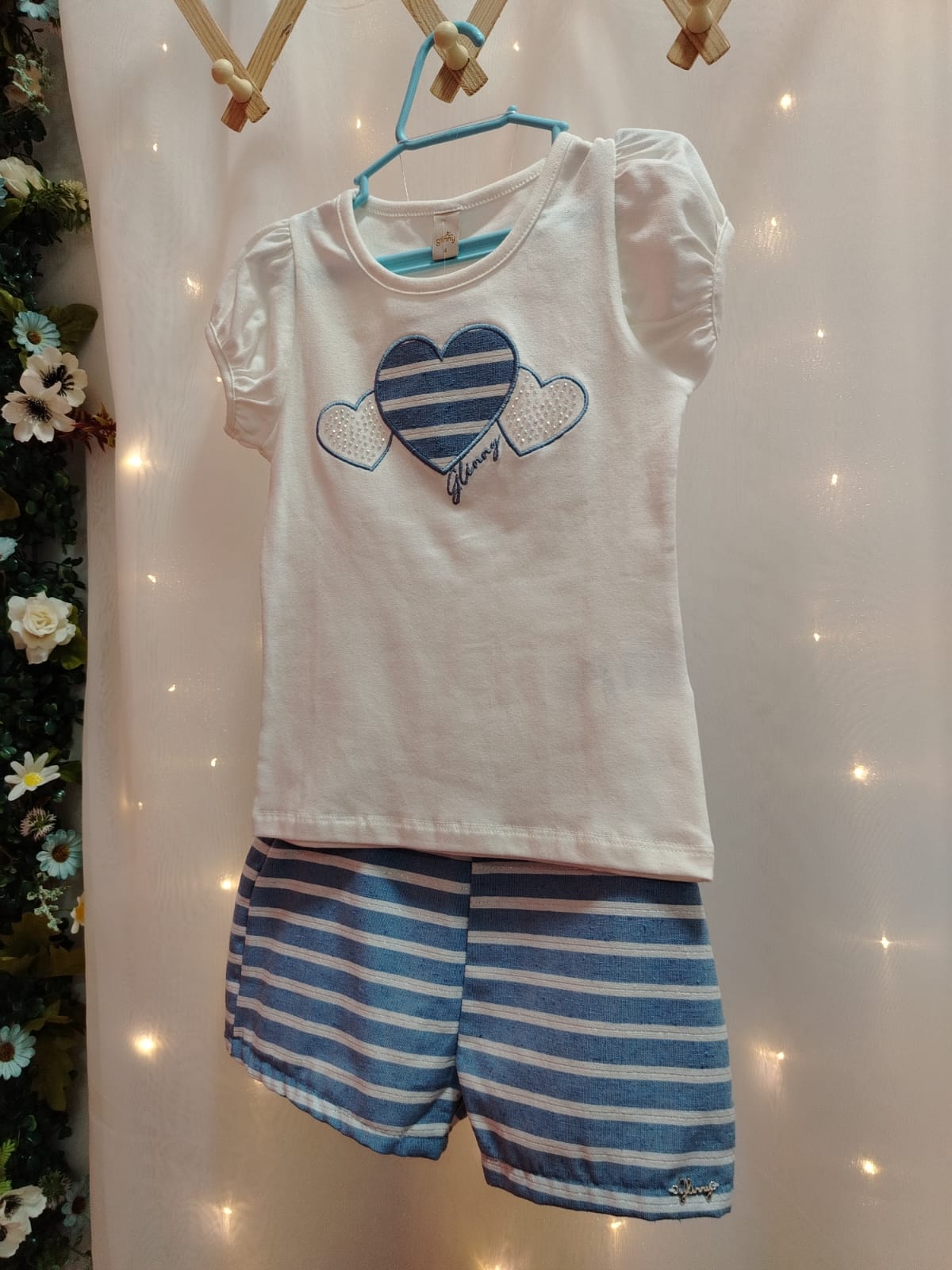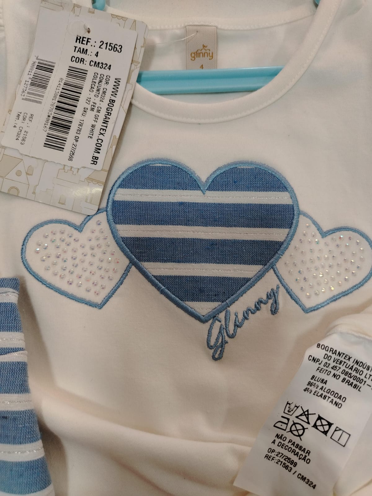 A camiseta possui manga curta levemente bufante e estampa frontal com três corações bordados. O coração central possui tecido listrado azul com aplicação em relevo, enquanto os corações laterais contam com aplicação de strass que trazem brilho delicado à peça. A escrita bordada “Glimny” complementa o design com charme.