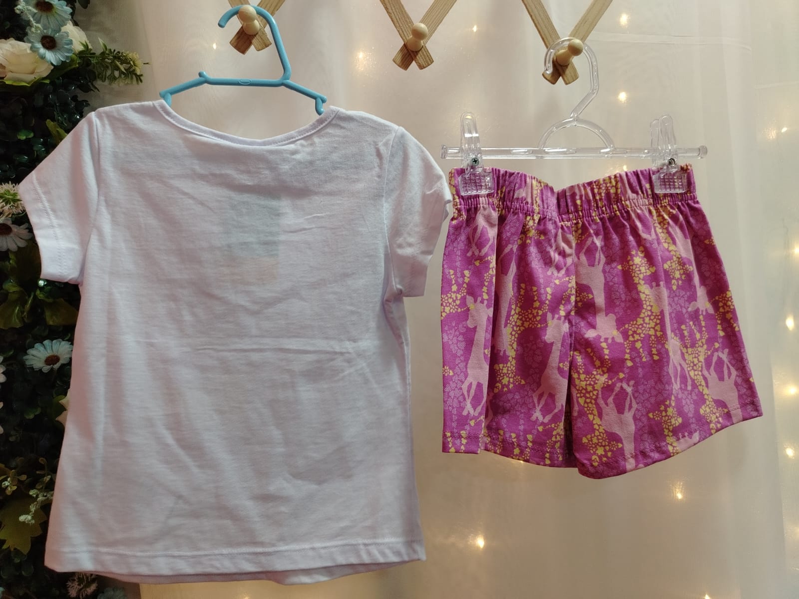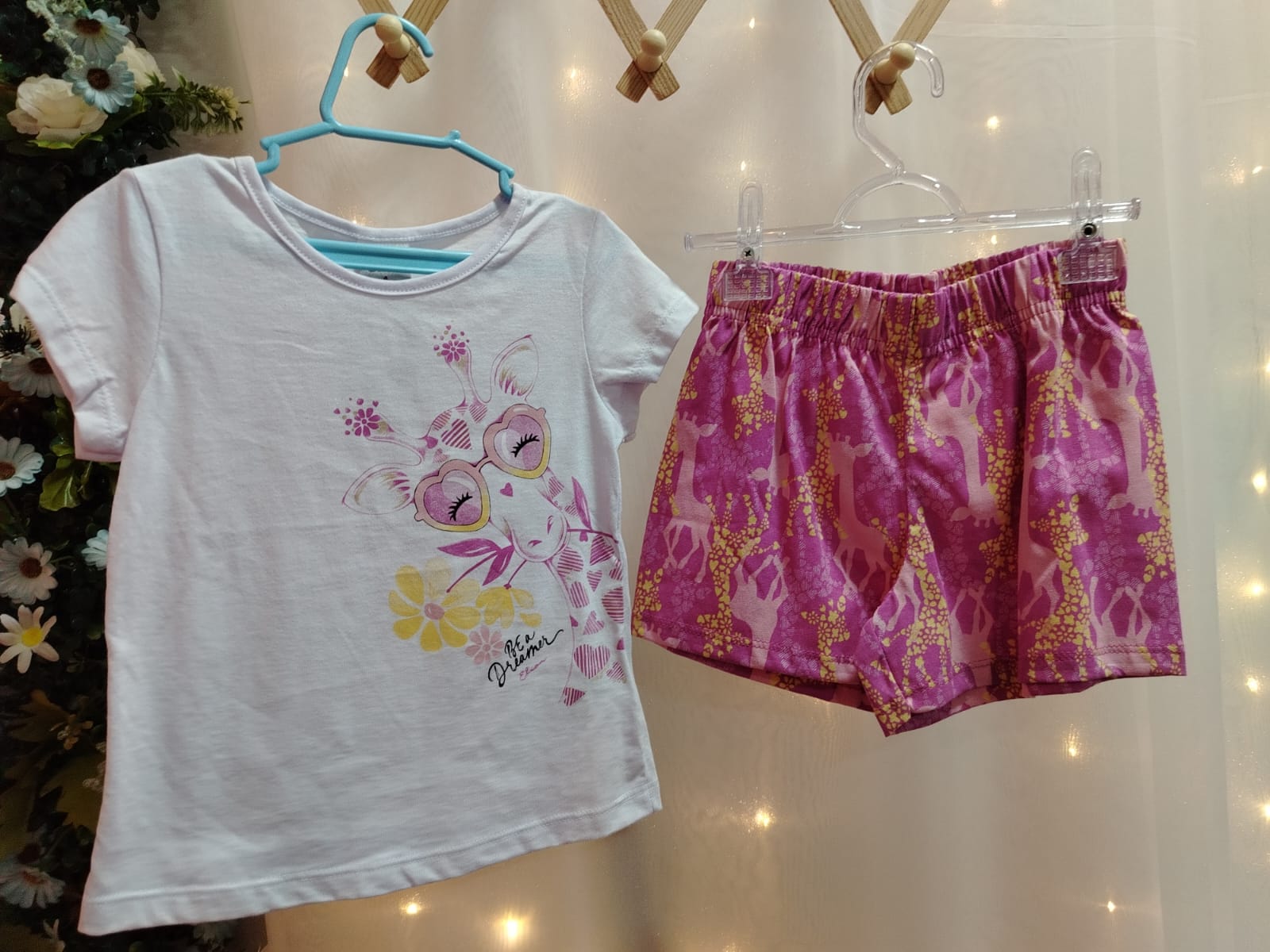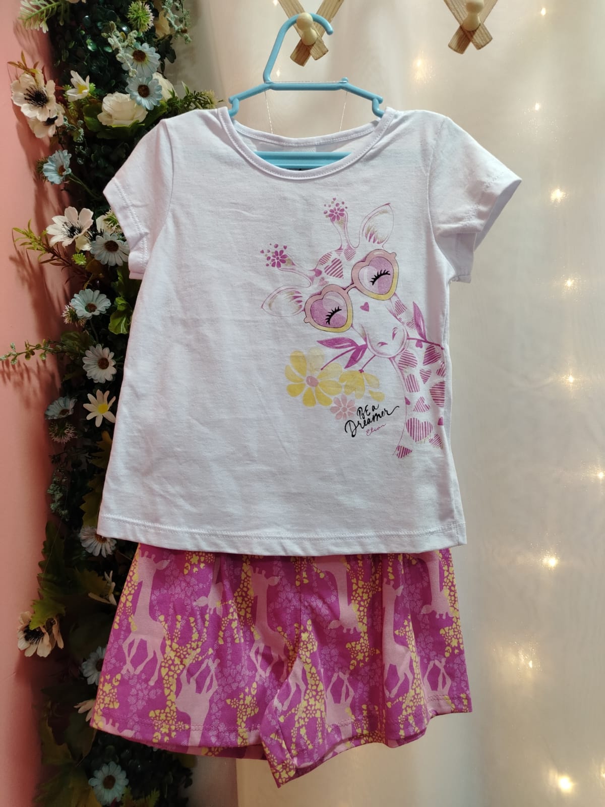 Conjunto infantil feminino composto por blusa manga curta em malha 100% algodão na cor branca, com estampa frontal de girafa usando óculos em formato de coração, flores e detalhes em tons de rosa e amarelo. Acompanha short estampado em malha 100% algodão, com elástico na cintura, na cor pink com estampa de girafas. Peça leve, confortável e ideal para o dia a dia. Tamanho 4 anos.