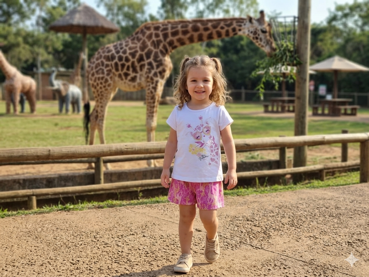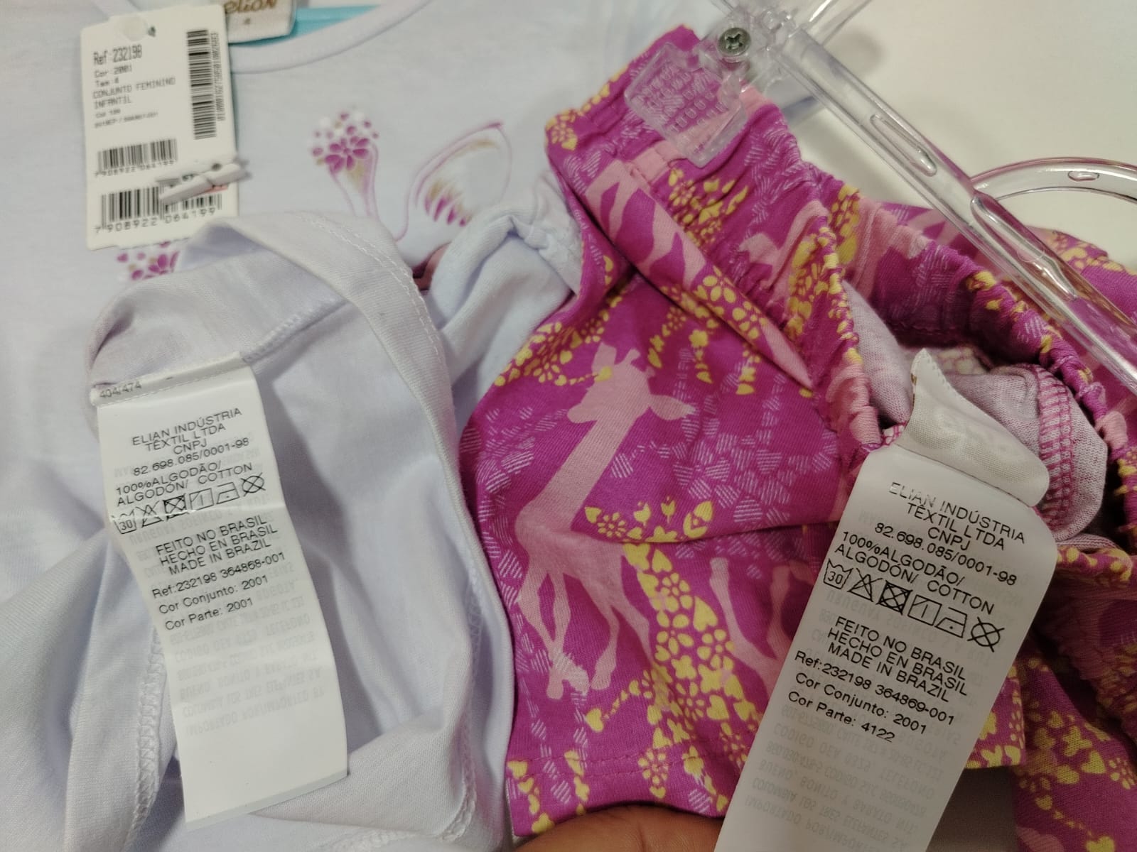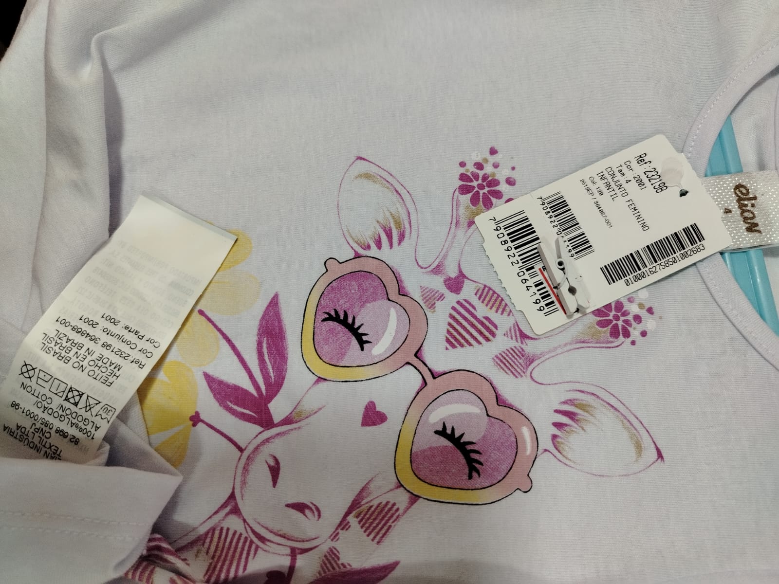 Conjunto infantil feminino composto por blusa manga curta em malha 100% algodão na cor branca, com estampa frontal de girafa usando óculos em formato de coração, flores e detalhes em tons de rosa e amarelo. Acompanha short estampado em malha 100% algodão, com elástico na cintura, na cor pink com estampa de girafas. Peça leve, confortável e ideal para o dia a dia. Tamanho 4 anos.