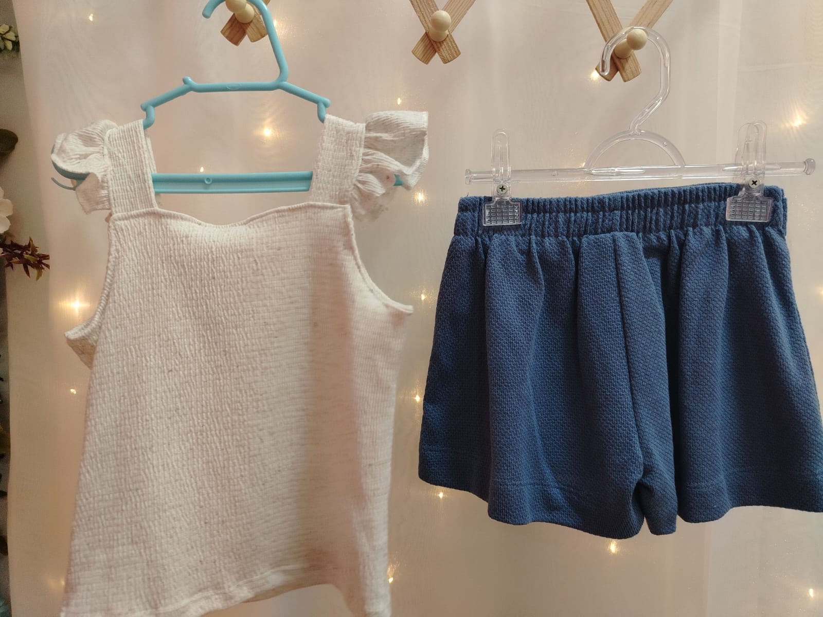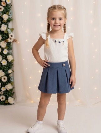 Conjunto infantil feminino composto por blusa em tom off-white com textura leve e detalhe delicado de bordados florais na parte frontal, além de aplicação charmosa em formato de letra. Possui alças largas com acabamento em babados, trazendo um visual delicado e confortável. Acompanha short saia na cor azul, com caimento estruturado, elástico na parte traseira para melhor ajuste ao corpo e botões decorativos frontais com detalhe em pérola. Peça ideal para compor looks elegantes e confortáveis para o dia a dia ou ocasiões especiais.