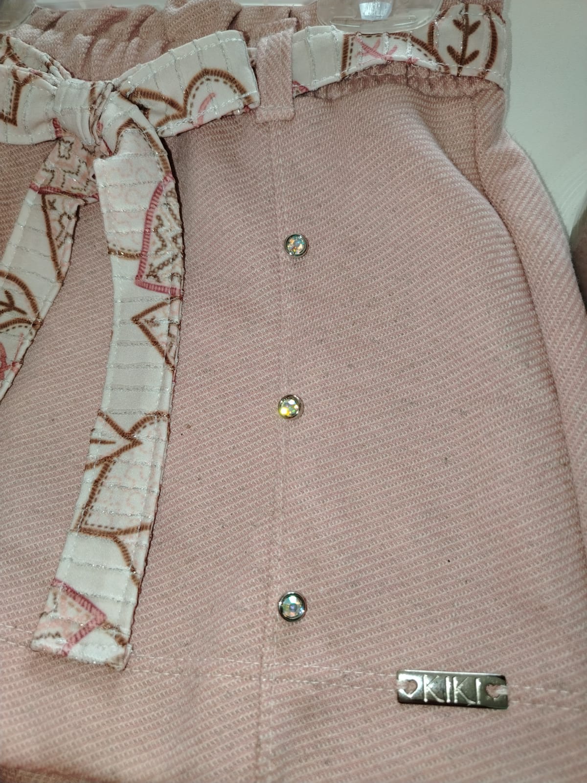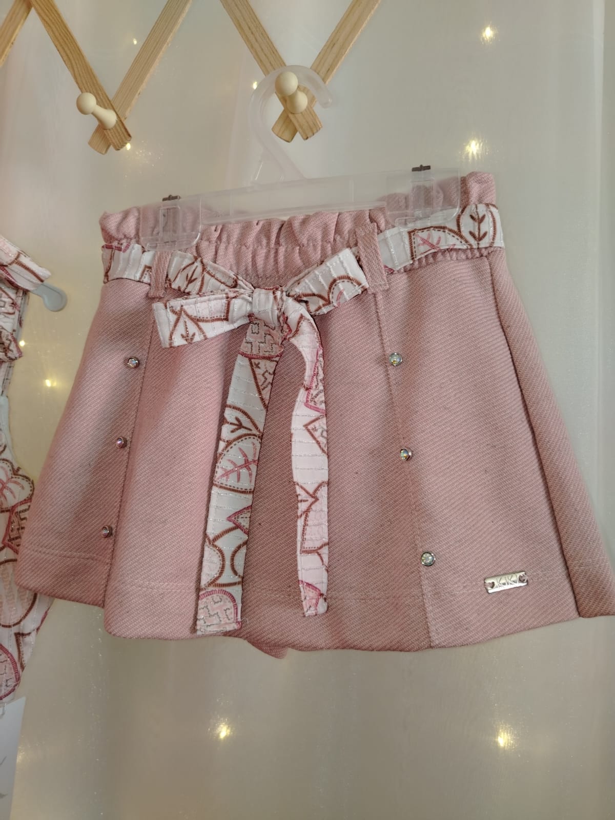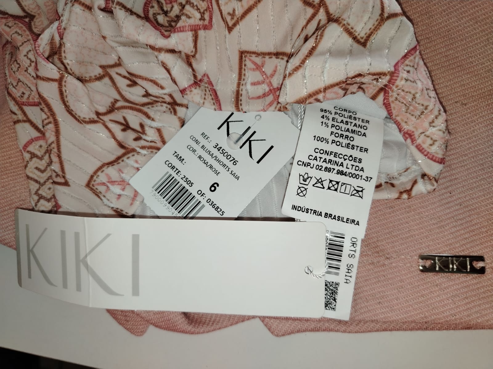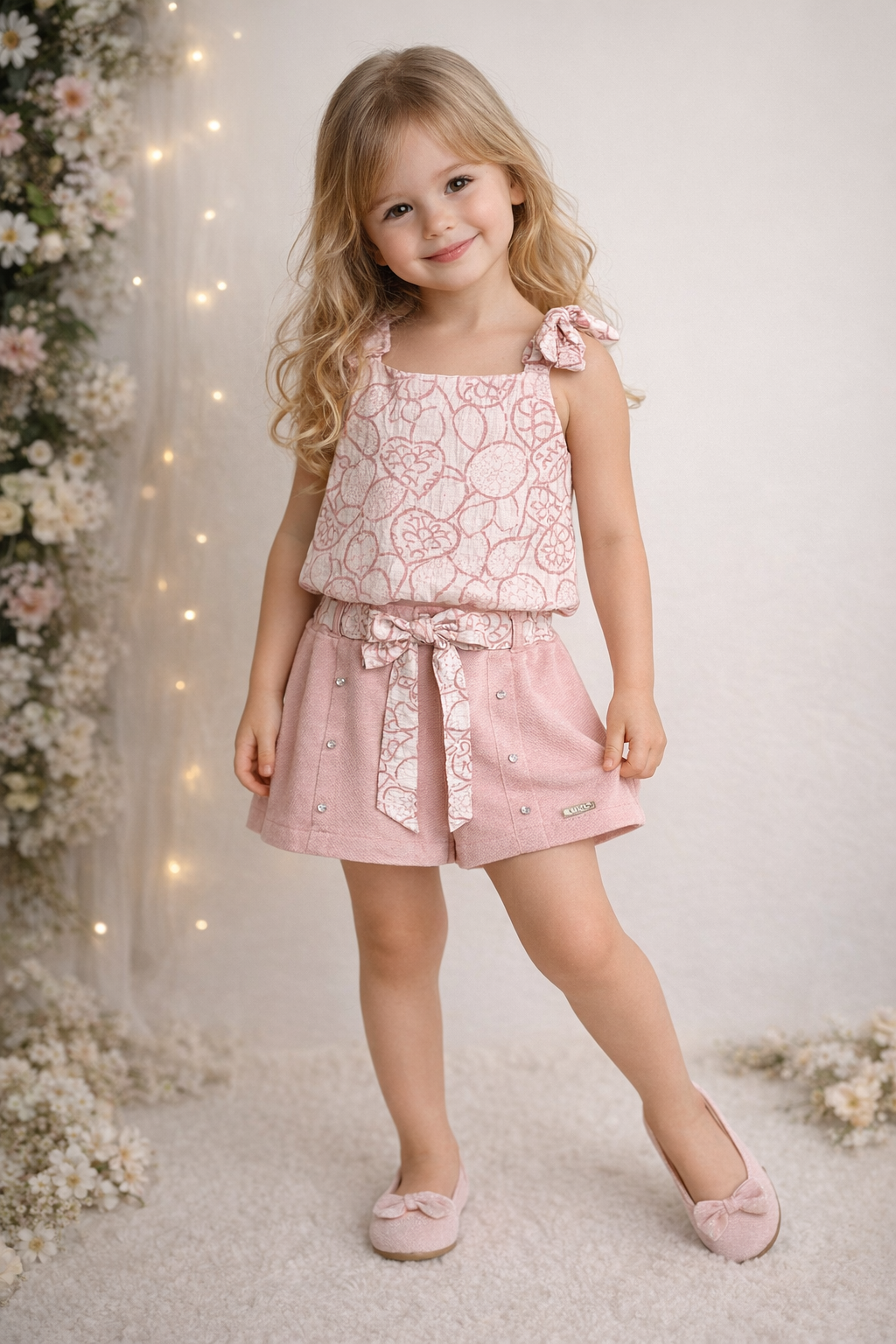 O shorts saia apresenta cós com elástico para melhor ajuste ao corpo, detalhe de laço frontal com o mesmo tecido da blusa, aplicação de pedrarias delicadas e acabamento de alta qualidade.