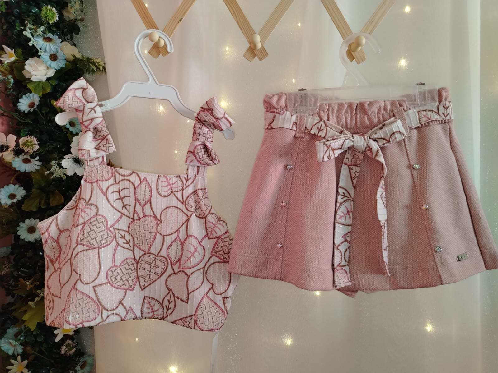 Conjunto infantil feminino composto por blusa e shorts saia, ideal para meninas de aproximadamente 6 anos.