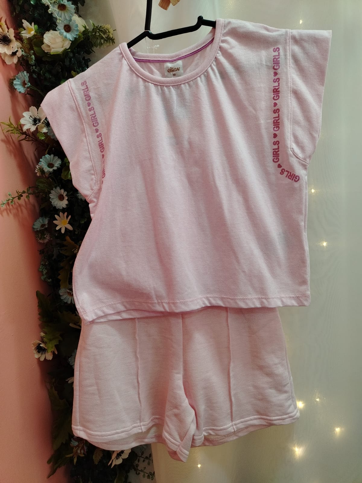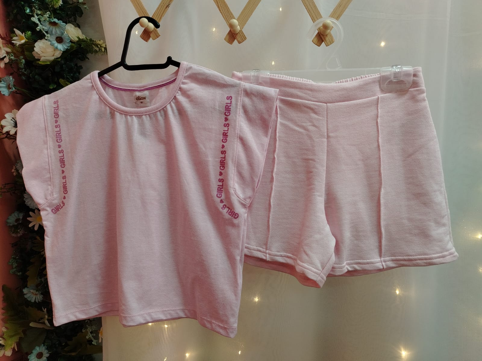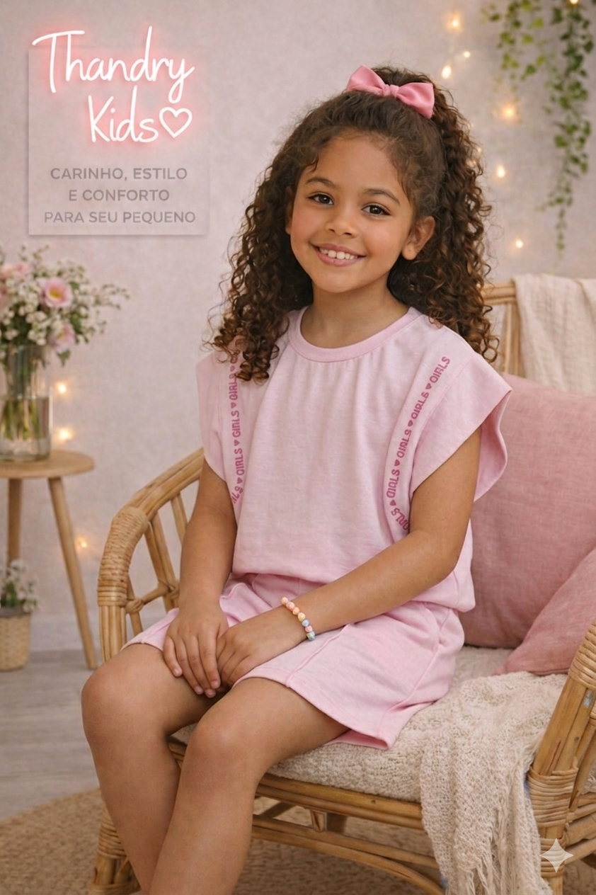 Conjunto infantil feminino composto por blusa e short, ideal para o dia a dia com conforto e estilo.