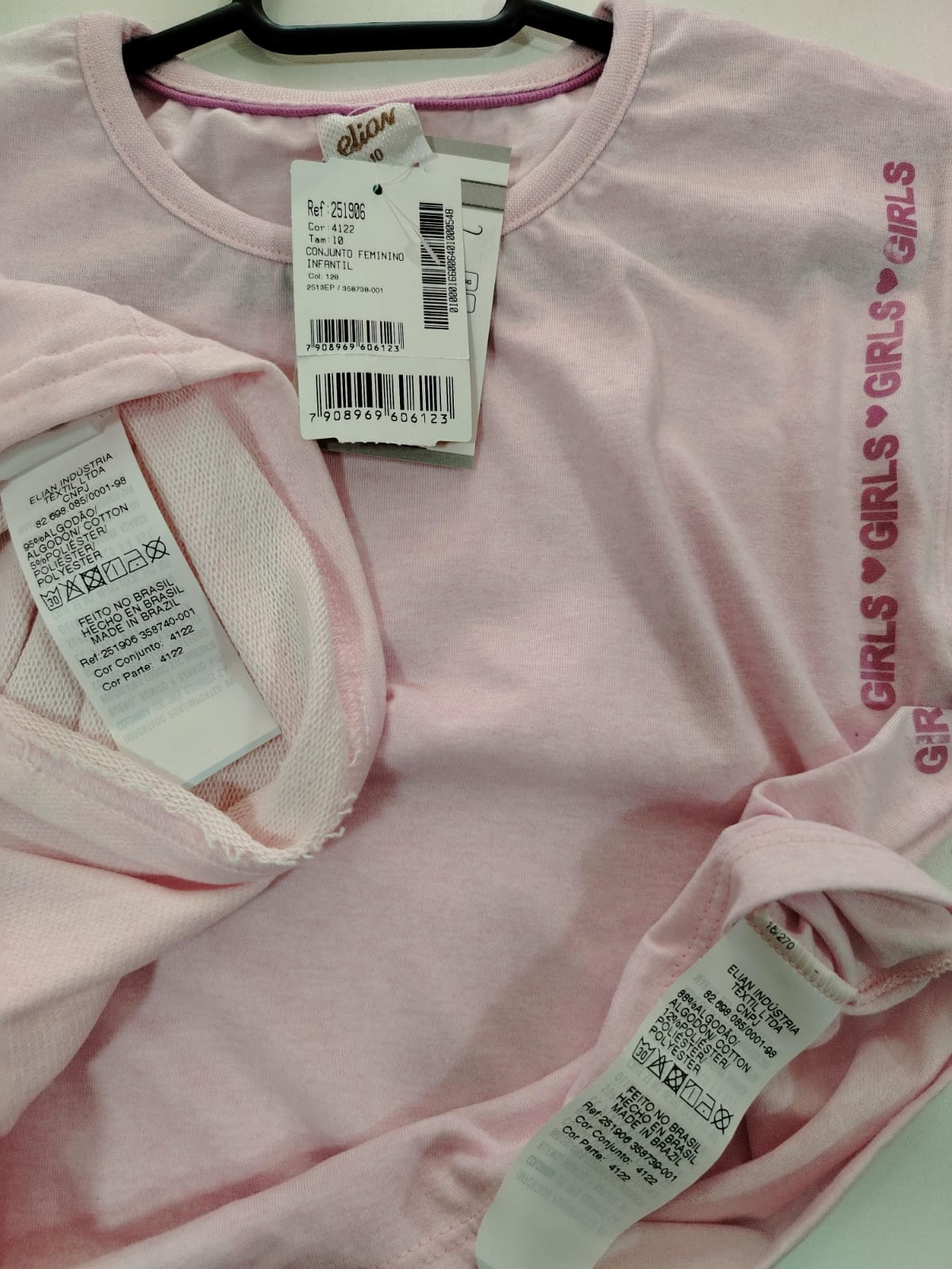 Blusa na cor rosa claro, confeccionada em malha macia, com modelagem soltinha e mangas amplas que proporcionam leveza e conforto. Possui estampa nas mangas com a escrita “Girls ♥ Girls”, trazendo um toque moderno e delicado.