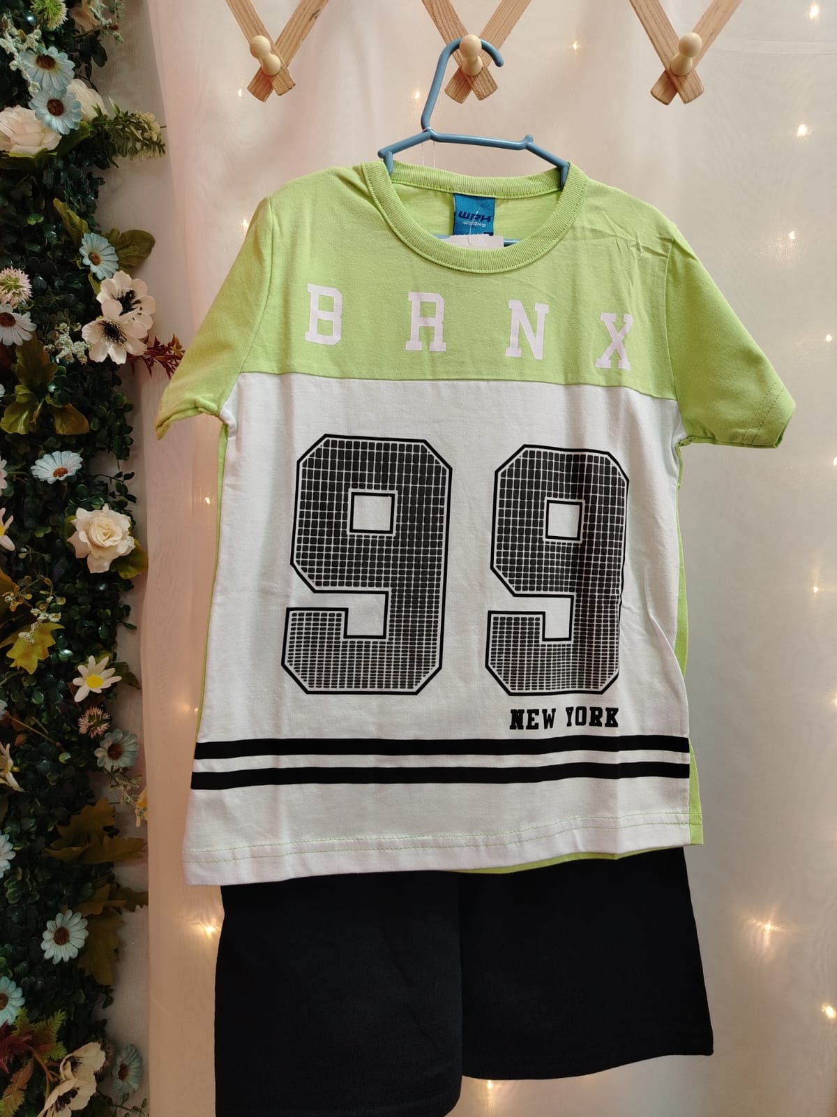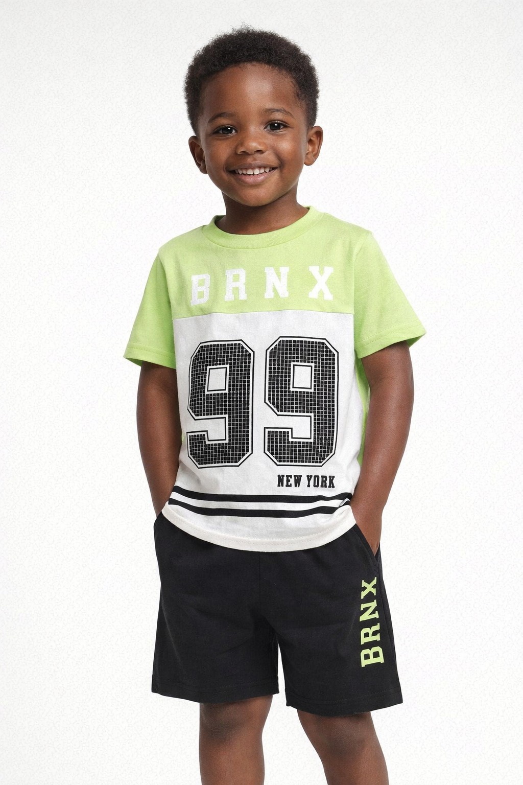 Conjunto infantil masculino composto por camiseta e bermuda, ideal para o dia a dia com muito conforto e estilo. A camiseta possui modelagem confortável, confeccionada em malha 100% algodão, com combinação de cores verde e branco. Apresenta estampa frontal com a escrita “BRNX” e número “99” em destaque, trazendo um visual moderno e esportivo. Conta com gola redonda e mangas curtas, proporcionando liberdade de movimento para a criança.