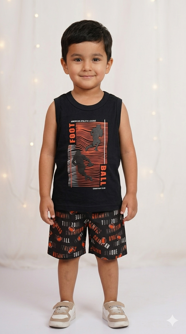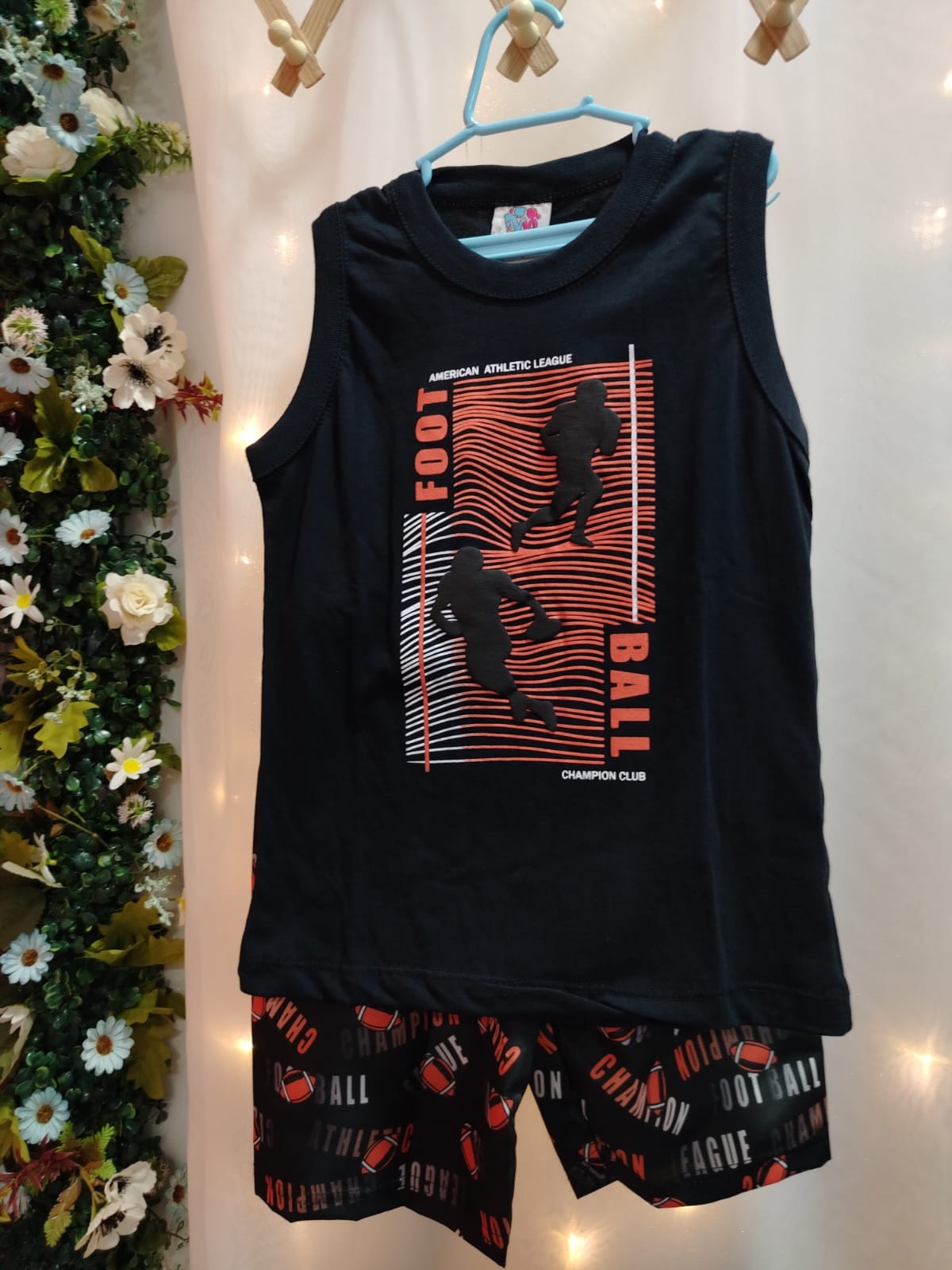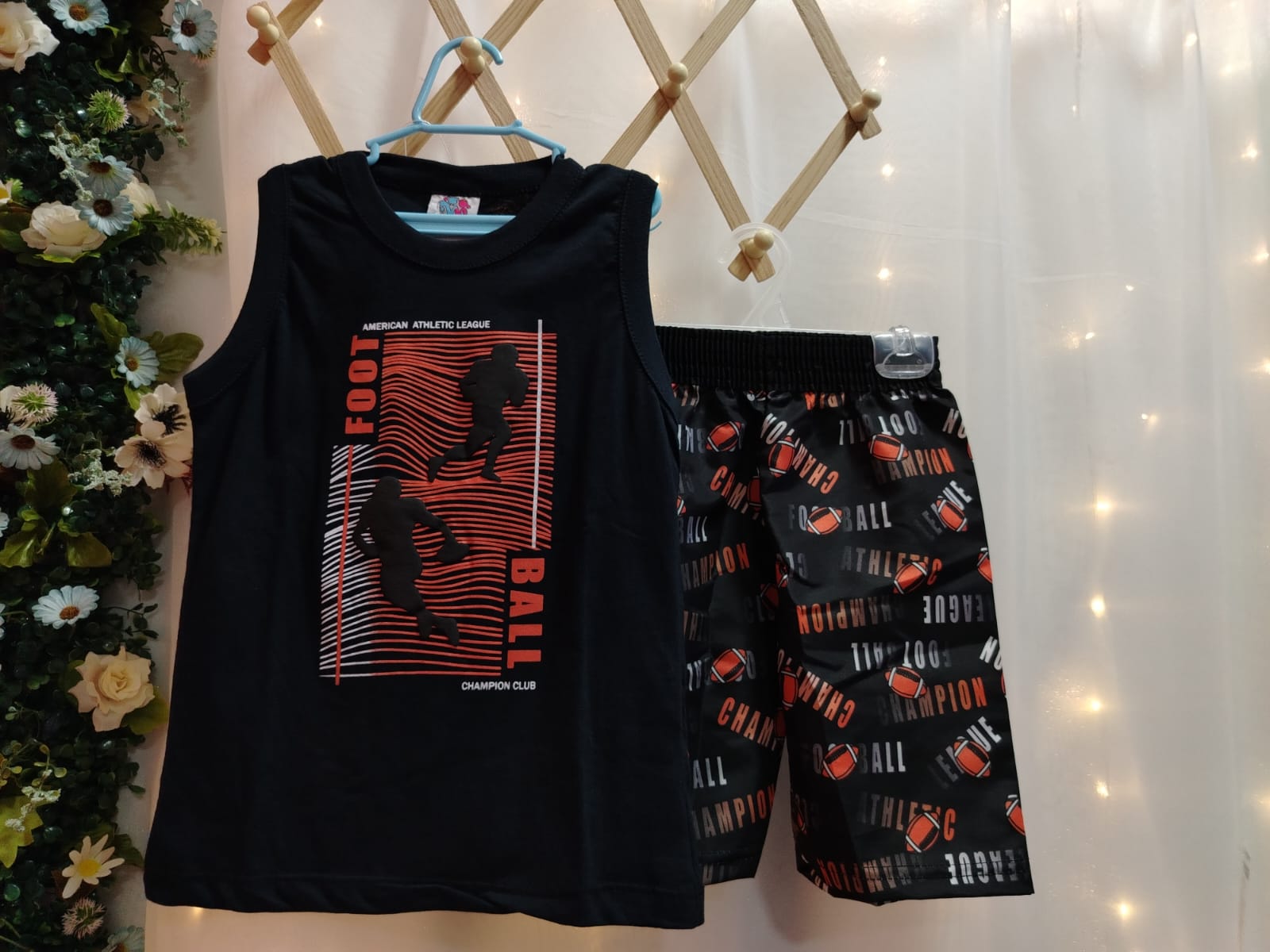 Conjunto infantil masculino composto por regata preta com estampa esportiva “Football” e bermuda estampada combinando. A regata possui modelagem confortável, tecido leve e estampa moderna com relevo, ideal para dias quentes.