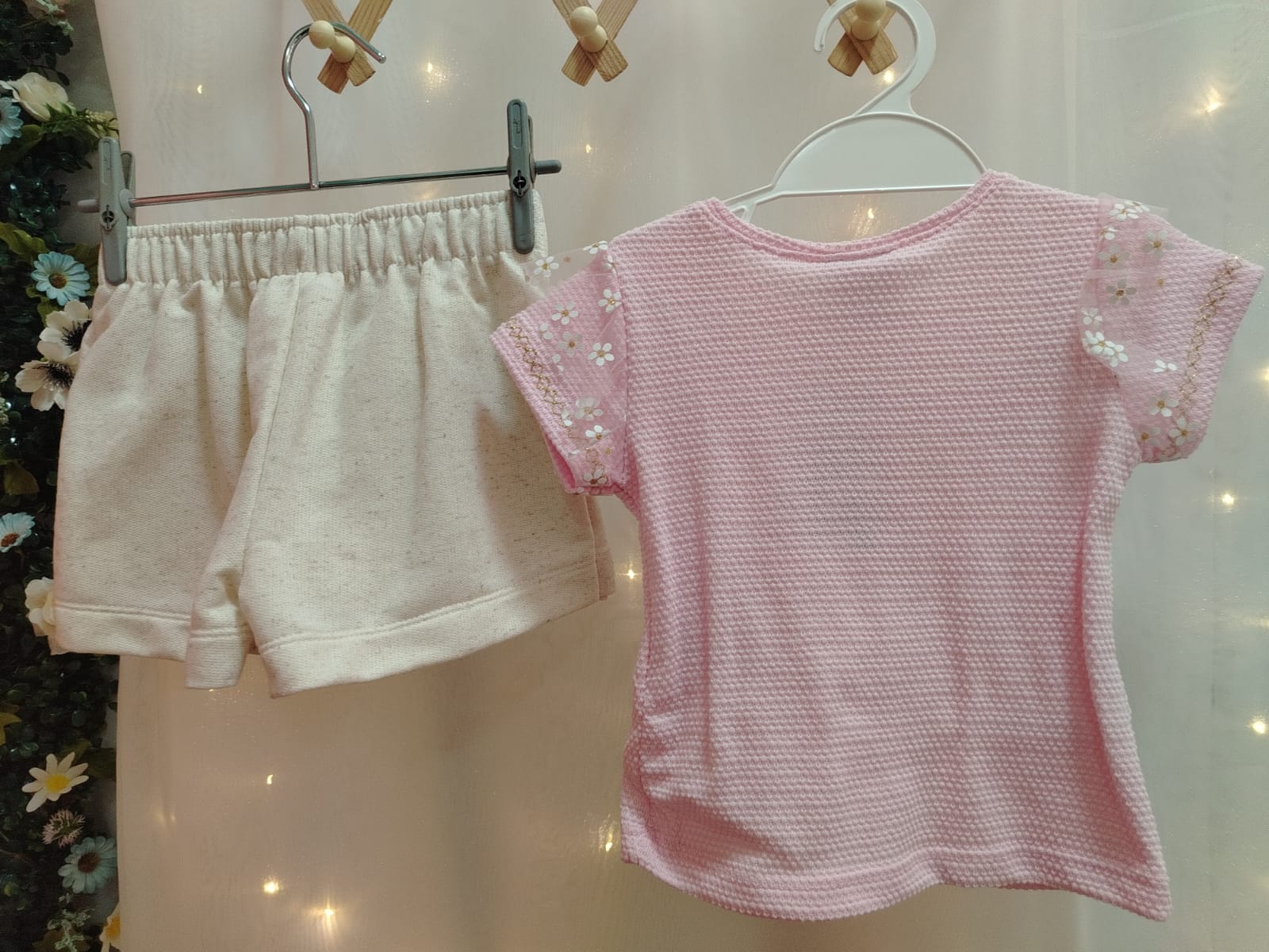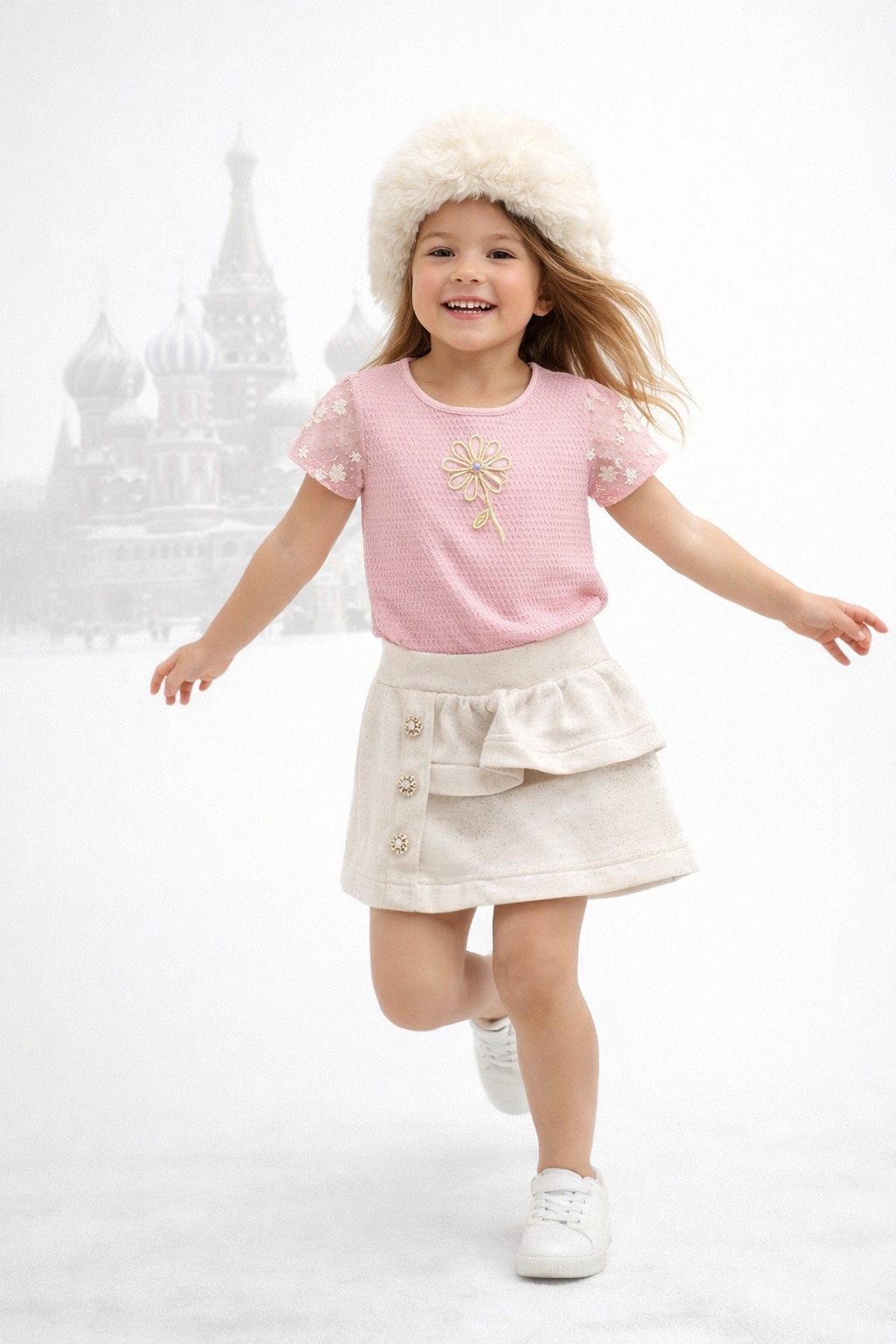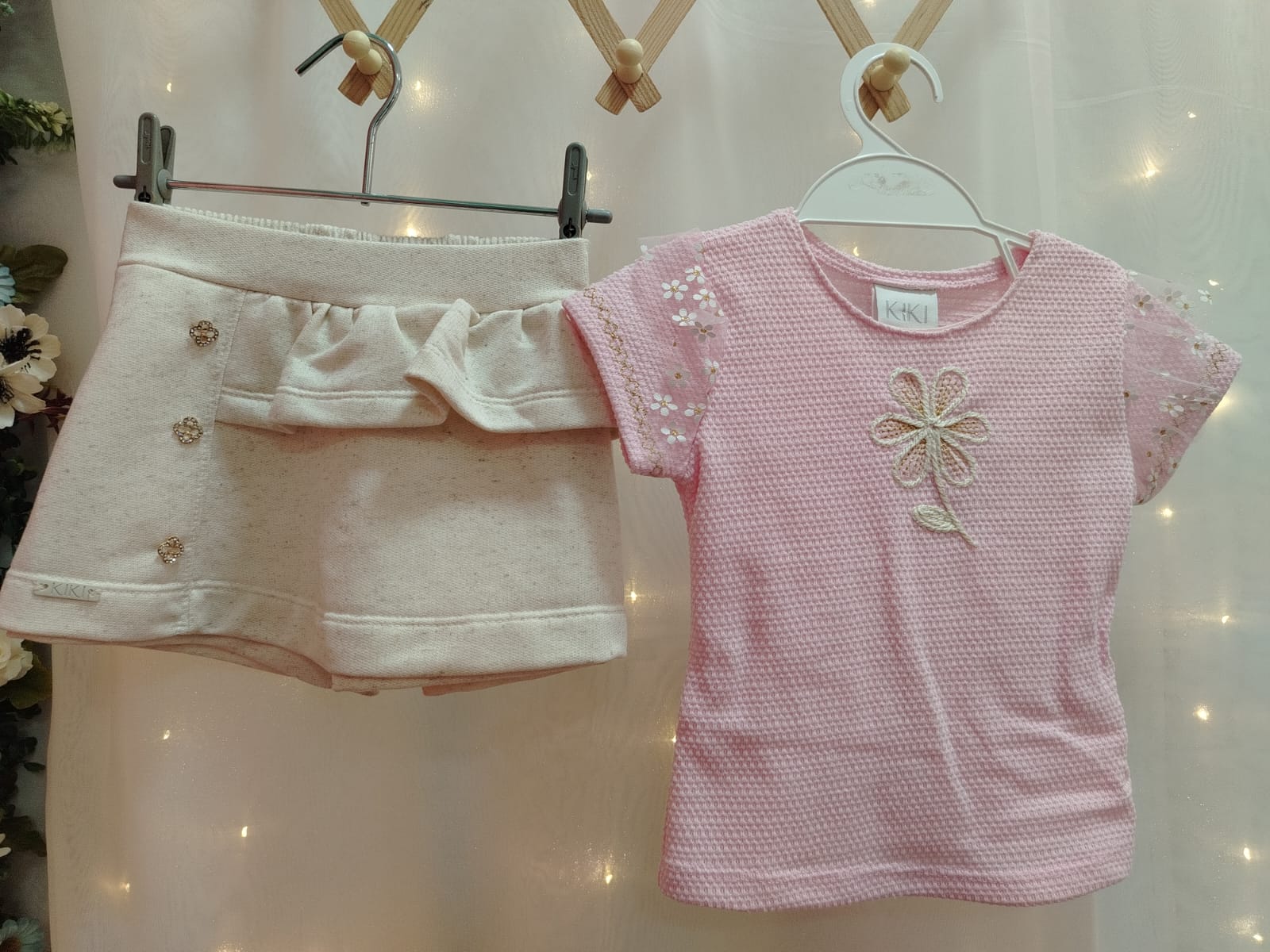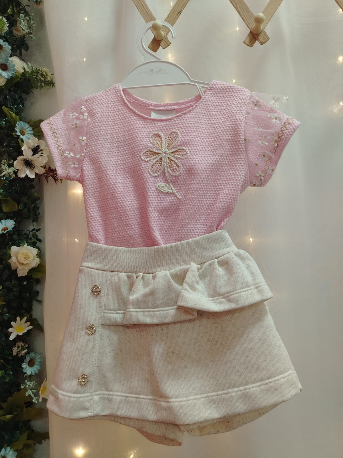 Conjunto infantil feminino composto por blusa e shorts saia, trazendo delicadeza e elegância para o look das pequenas. A blusa na cor rosa possui tecido texturizado, mangas com leve transparência e aplicação de flores delicadas, além de um bordado frontal em formato de flor com detalhes sutis em brilho, proporcionando charme ao visual. O shorts saia em tom off-white complementa o conjunto com um design sofisticado, contendo sobreposição frontal que imita saia, detalhe de babado e botões decorativos com pedrarias, agregando um toque refinado. Possui cós com elástico, garantindo conforto e melhor ajuste ao corpo.