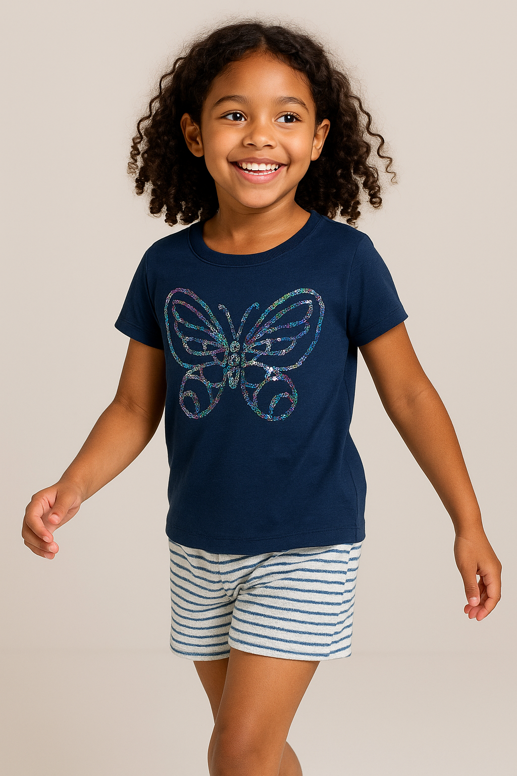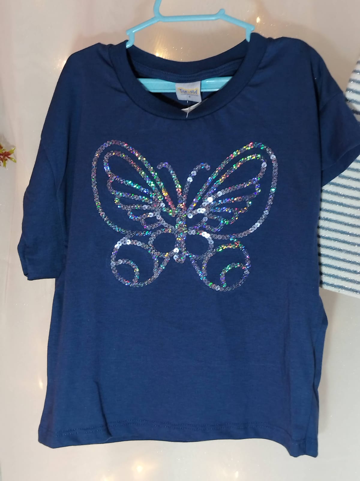 A blusa é confeccionada em malha 100% algodão, na cor petróleo, com estampa de borboleta em paetês holográficos que trazem brilho e delicadeza ao visual. Possui modelagem soltinha, mangas curtas e gola redonda.