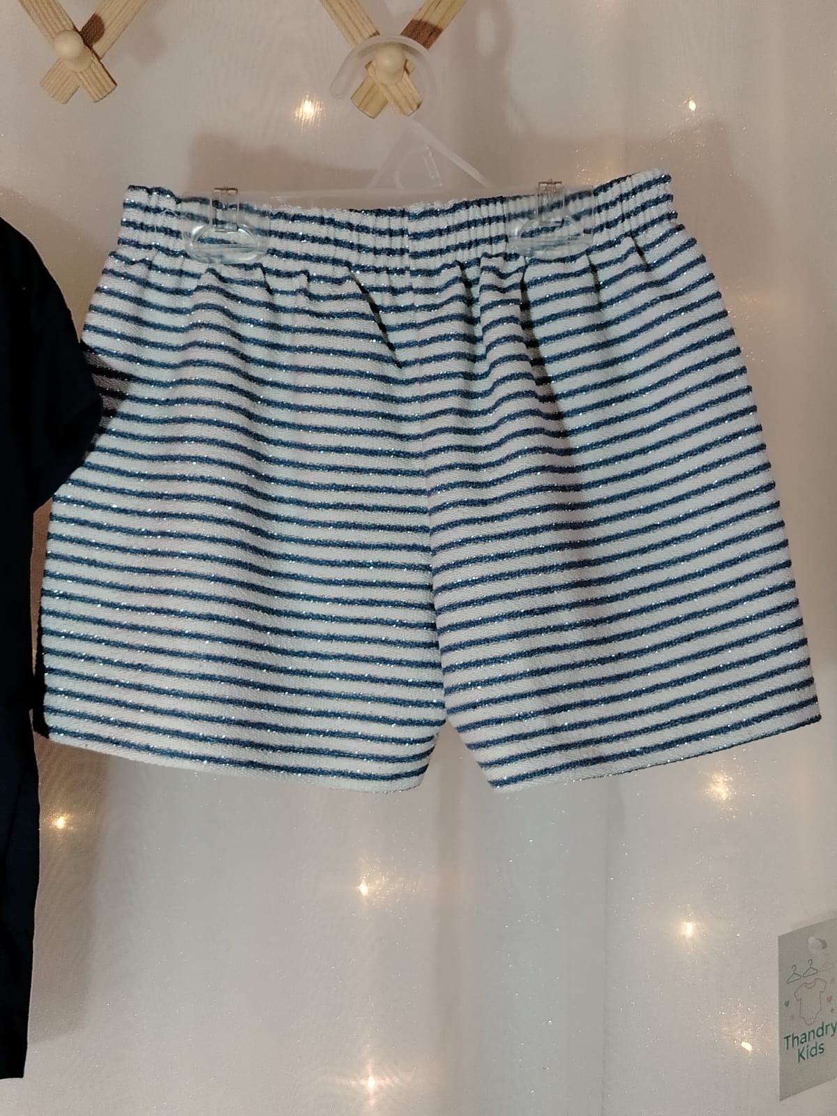 O shorts é feito em moletinho listrado branco com azul petróleo e detalhes de lurex, garantindo conforto e um toque de brilho moderno. Cós com elástico para melhor ajuste.