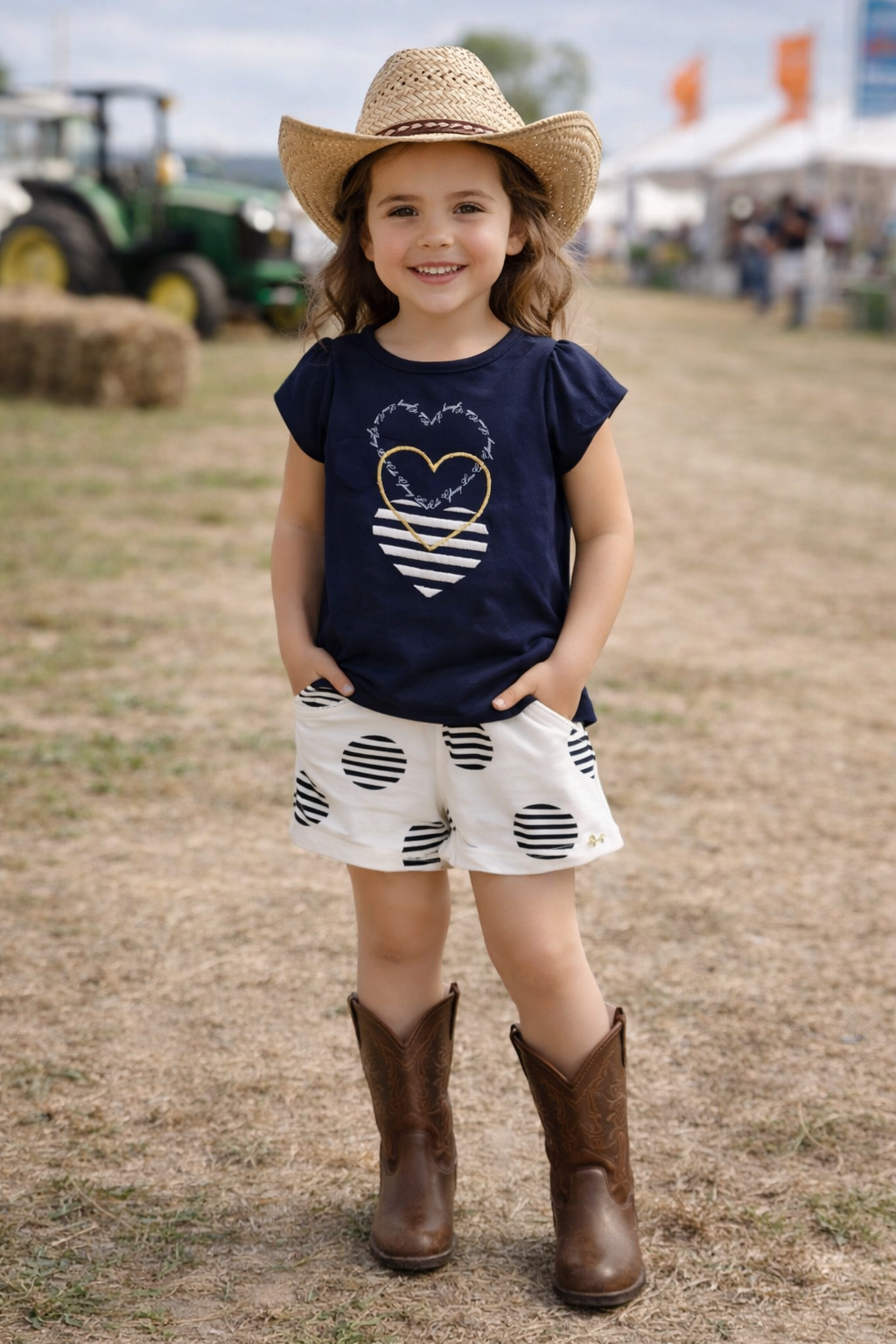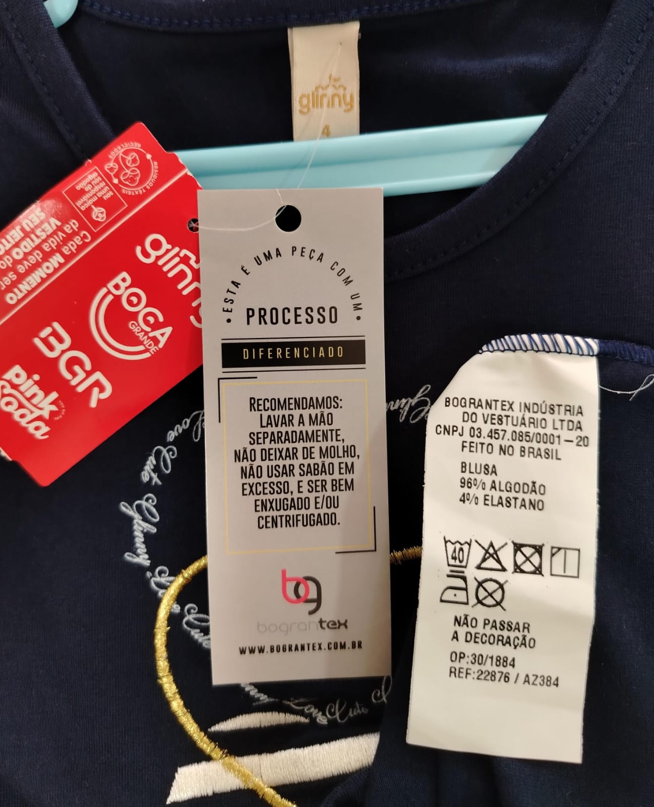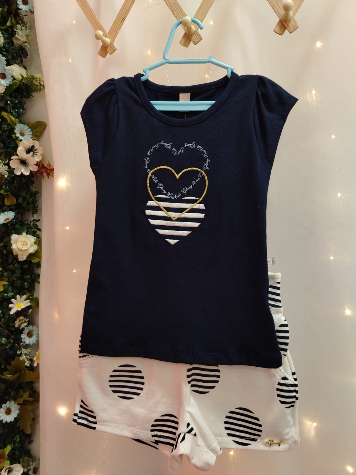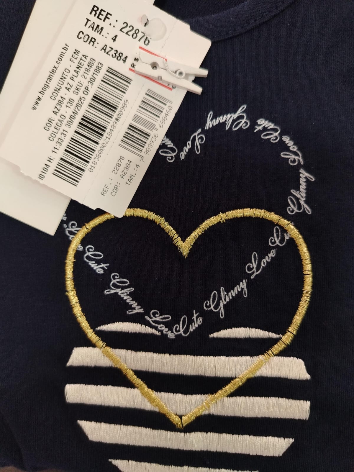 A blusa possui cor azul marinho com mangas curtas levemente franzidas, trazendo um toque delicado ao visual. O destaque da peça é o lindo bordado de coração na parte frontal, com contorno dourado e detalhes em listras brancas, acompanhado de escrita decorativa que deixa o modelo moderno e elegante.