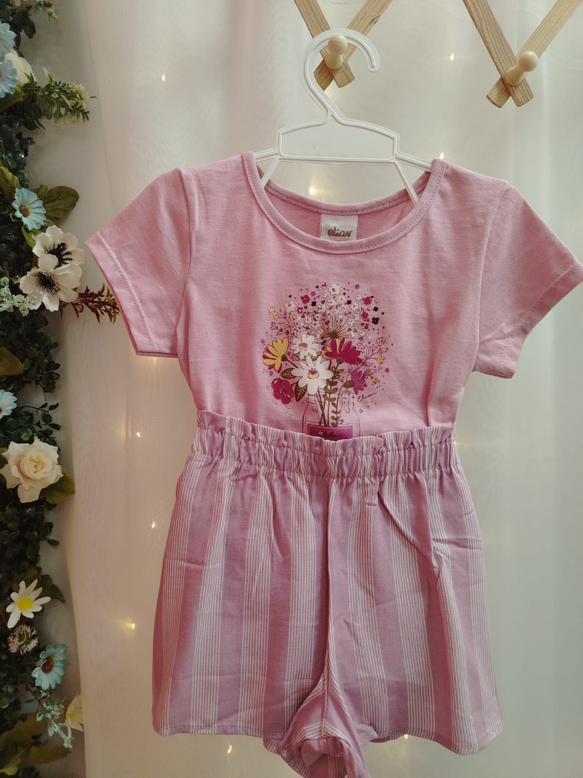 Conjunto infantil feminino composto por blusa e shorts, ideal para o dia a dia com conforto e estilo. A blusa na cor rosa possui modelagem básica com mangas curtas e estampa frontal delicada de flores em tons de rosa, branco e amarelo, com leve toque de brilho, trazendo um visual alegre e feminino. O shorts acompanha o conjunto em tecido leve com listras verticais em tom rosa claro, possui cós com elástico proporcionando melhor ajuste ao corpo da criança e maior conforto durante o uso.