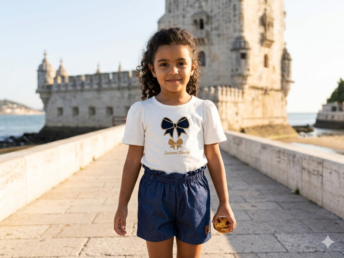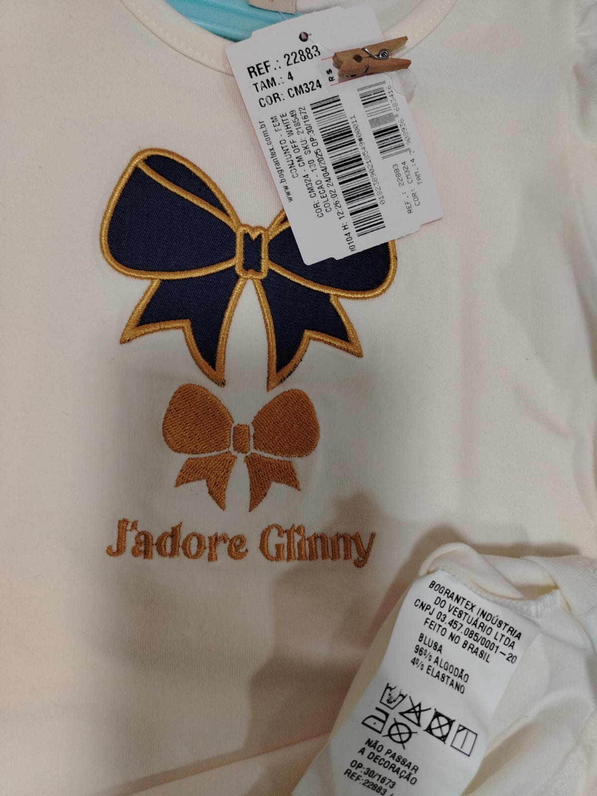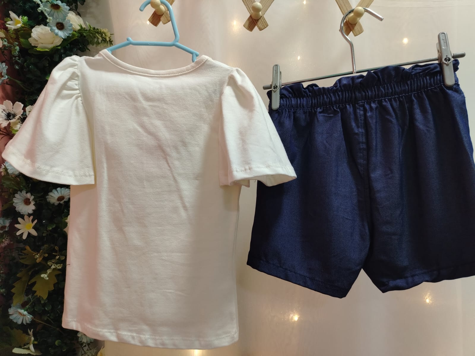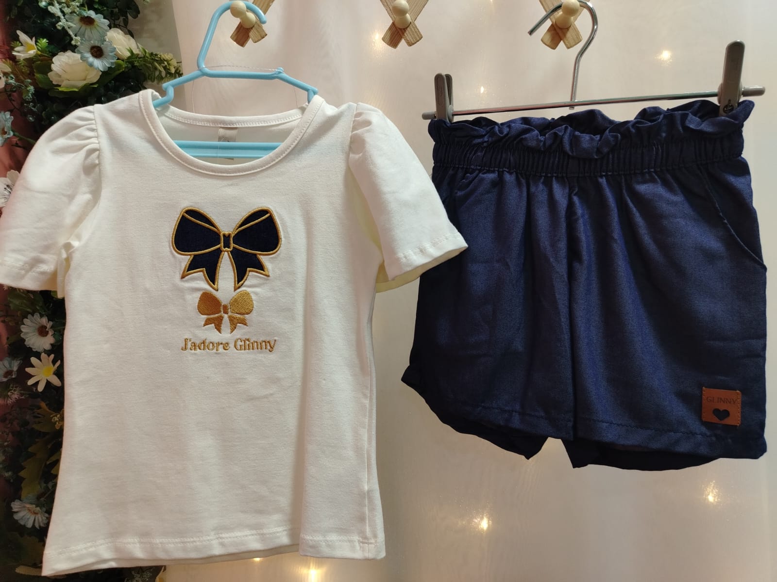 Conjunto infantil feminino composto por blusa e shorts, ideal para meninas de 4 anos. A blusa na cor off white possui modelagem confortável com mangas levemente bufantes e detalhe frontal em bordado de laço em tons de azul marinho e dourado, trazendo um visual delicado e sofisticado.