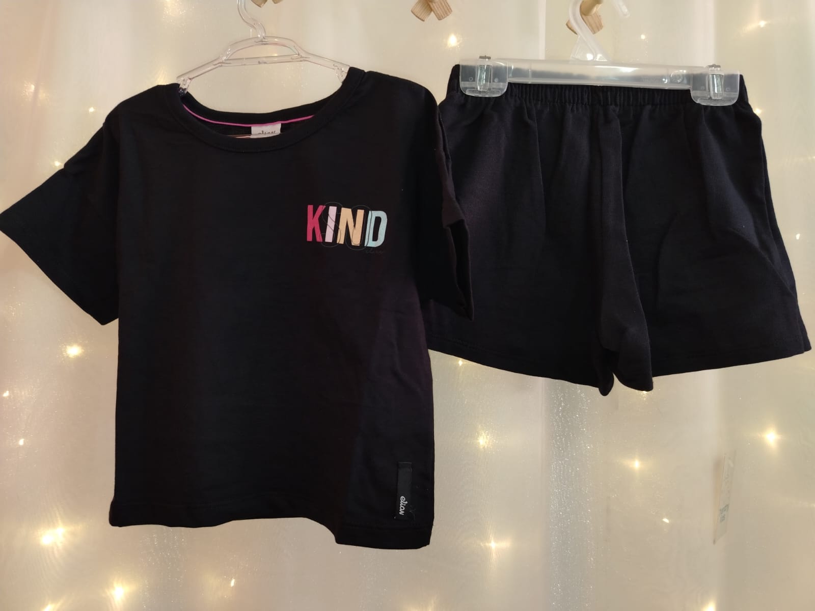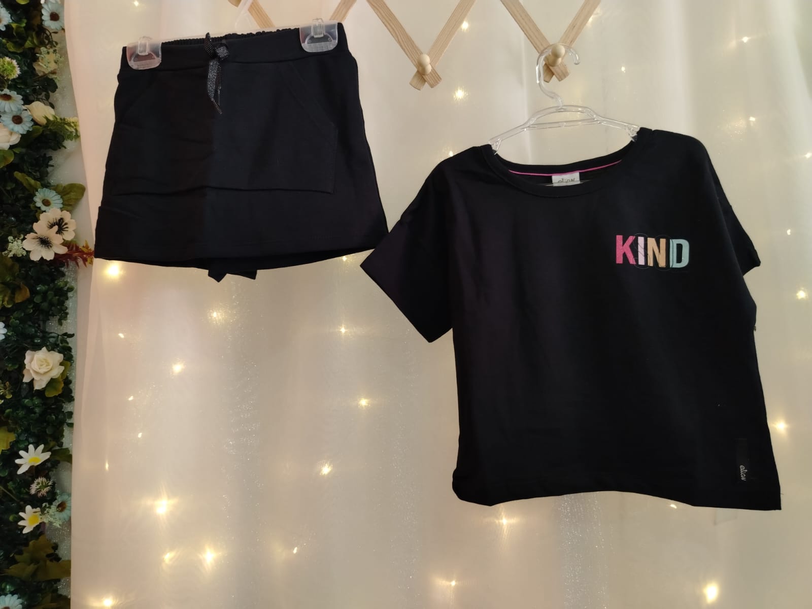 Conjunto infantil feminino composto por blusa preta com estampa “KIND” em tons coloridos e short saia preto, ideal para o dia a dia, passeios e looks confortáveis.