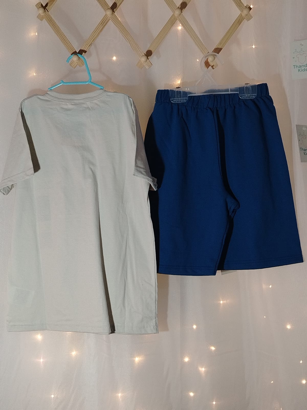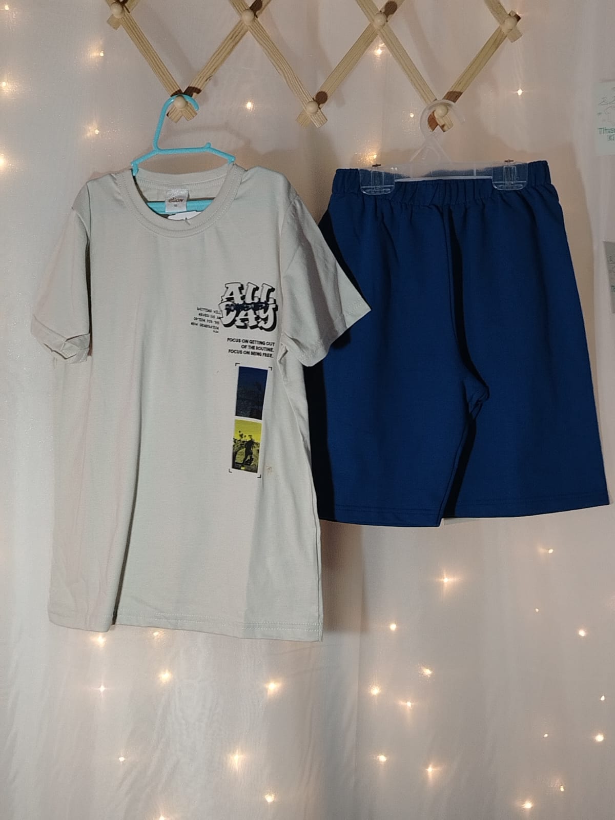 Conjunto infantil masculino Elian confeccionado em 100% algodão, composto por camiseta verde-clara com estampa frontal moderna “ALL DAY” e bermuda azul marinho em malha confortável.