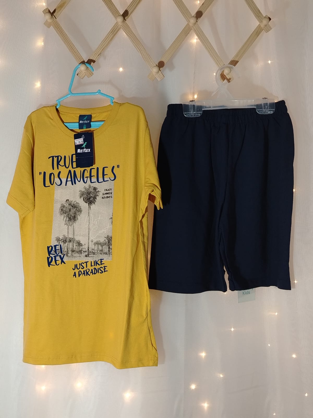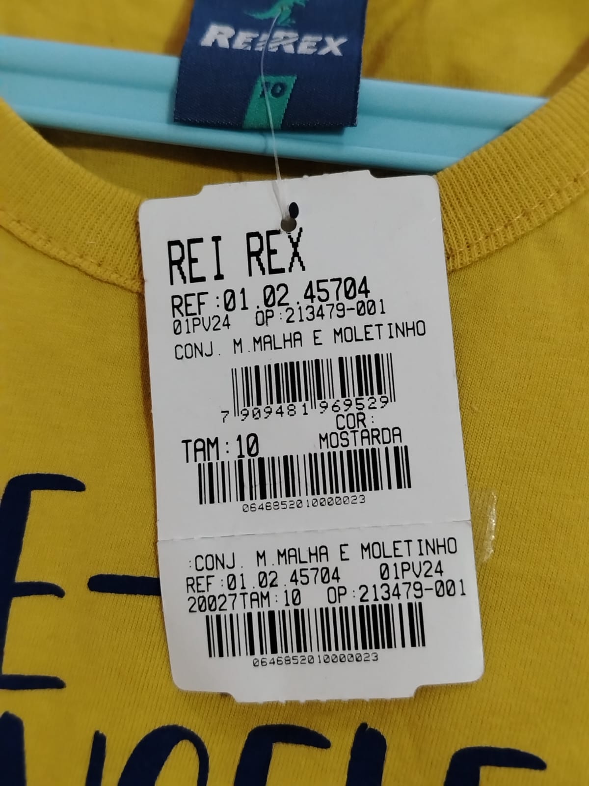 Conjunto infantil masculino da marca Rei Rex, composto por camiseta de malha 100% algodão na cor mostarda e bermuda de moletinho azul marinho.