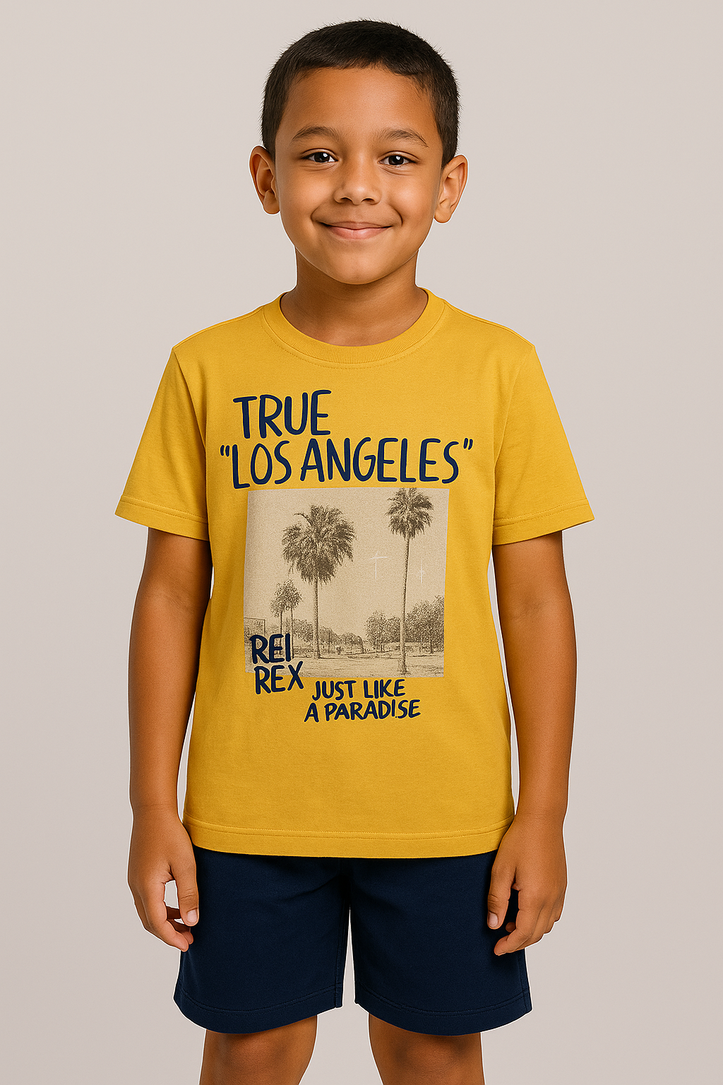 A camiseta possui estampa frontal com tema “True Los Angeles – Just Like a Paradise” e modelagem confortável.