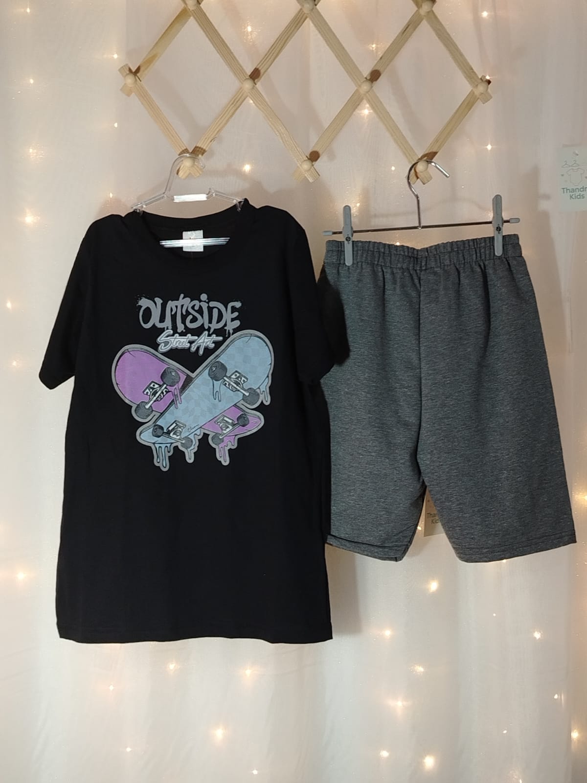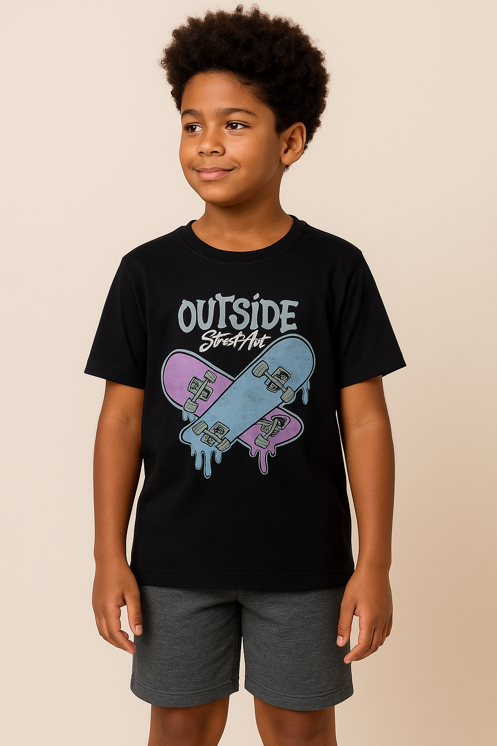 A camiseta preta possui estampa moderna com o tema Outside Street Art, trazendo estilo urbano e descolado.