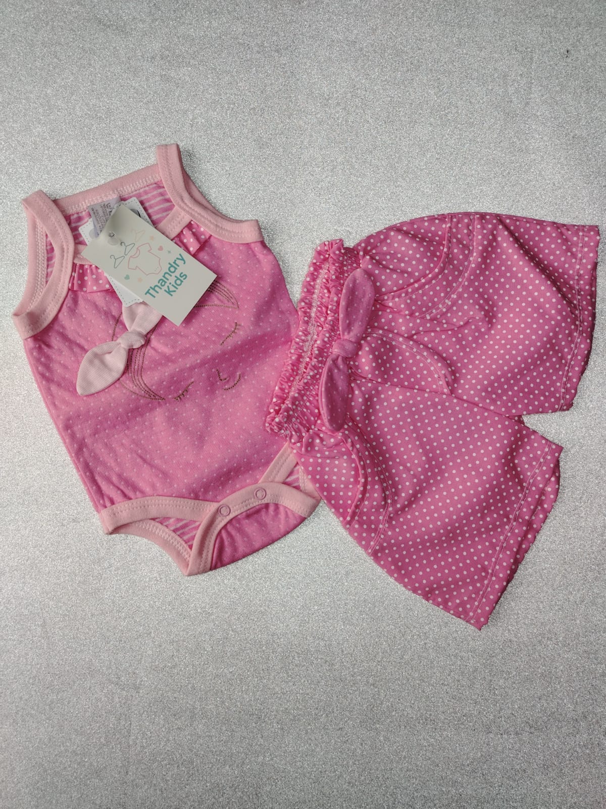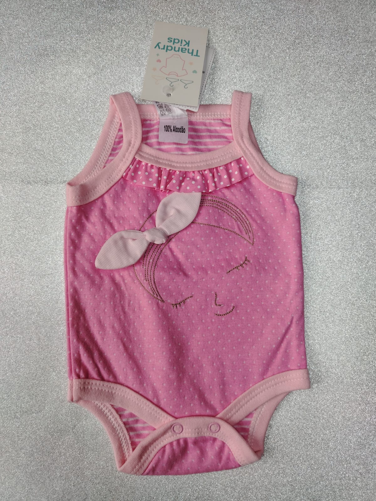 Conjunto infantil feminino composto por body regata e shorts, confeccionado em 100% algodão, ideal para proporcionar conforto e delicadeza ao bebê. O body na cor rosa possui estampa de poás brancos, detalhe bordado de rostinho e laço aplicado na frente, além de fechamento com botões de pressão entre as perninhas para facilitar a troca. A gola e cavas têm acabamento em viés que garante melhor caimento e durabilidade. O shorts acompanha a peça em tecido leve, também rosa com poás brancos, cós com elástico embutido para ajuste confortável e detalhe de lacinho decorativo central. Conjunto prático, macio e perfeito para…