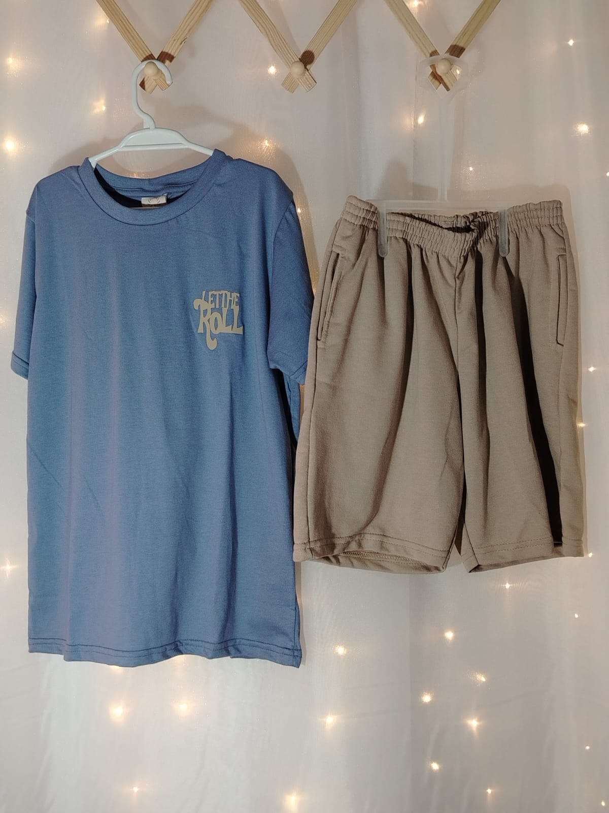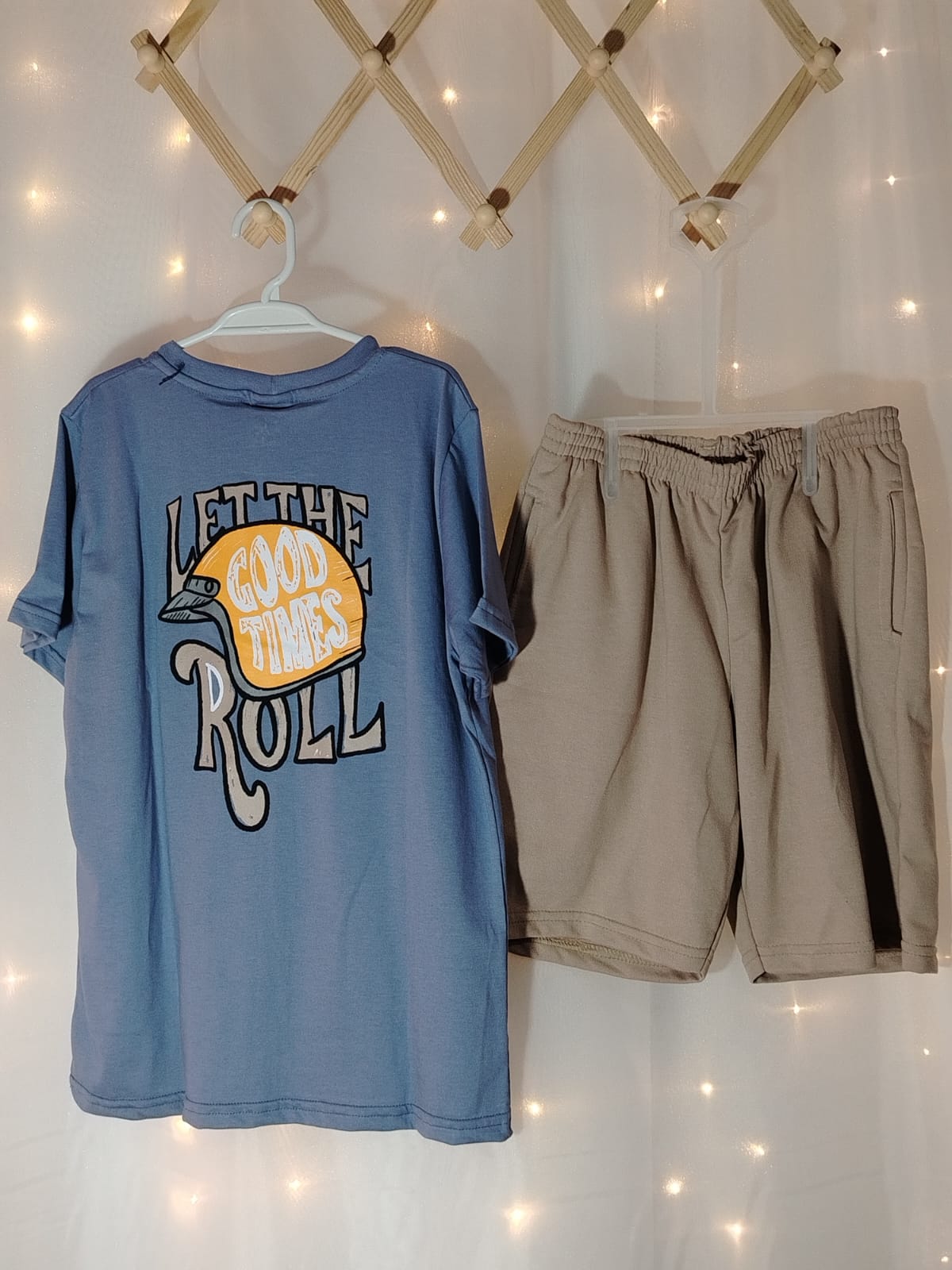 Conjunto Camiseta Azul Let the Good Times Roll + Bermuda Bege 09904452 Menino 10 anos