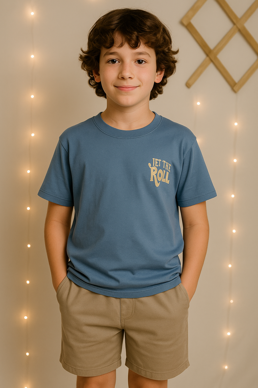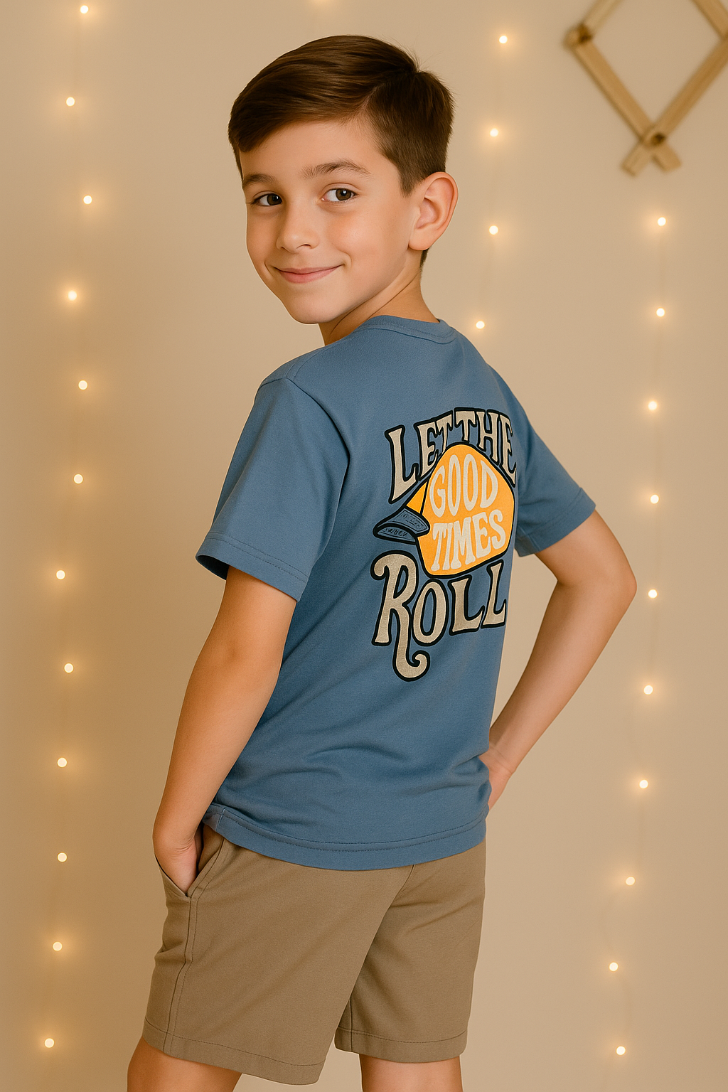 A camiseta azul possui estampa frontal e traseira com a frase “Let the Good Times Roll”, confeccionada em algodão confortável e macio ao toque.