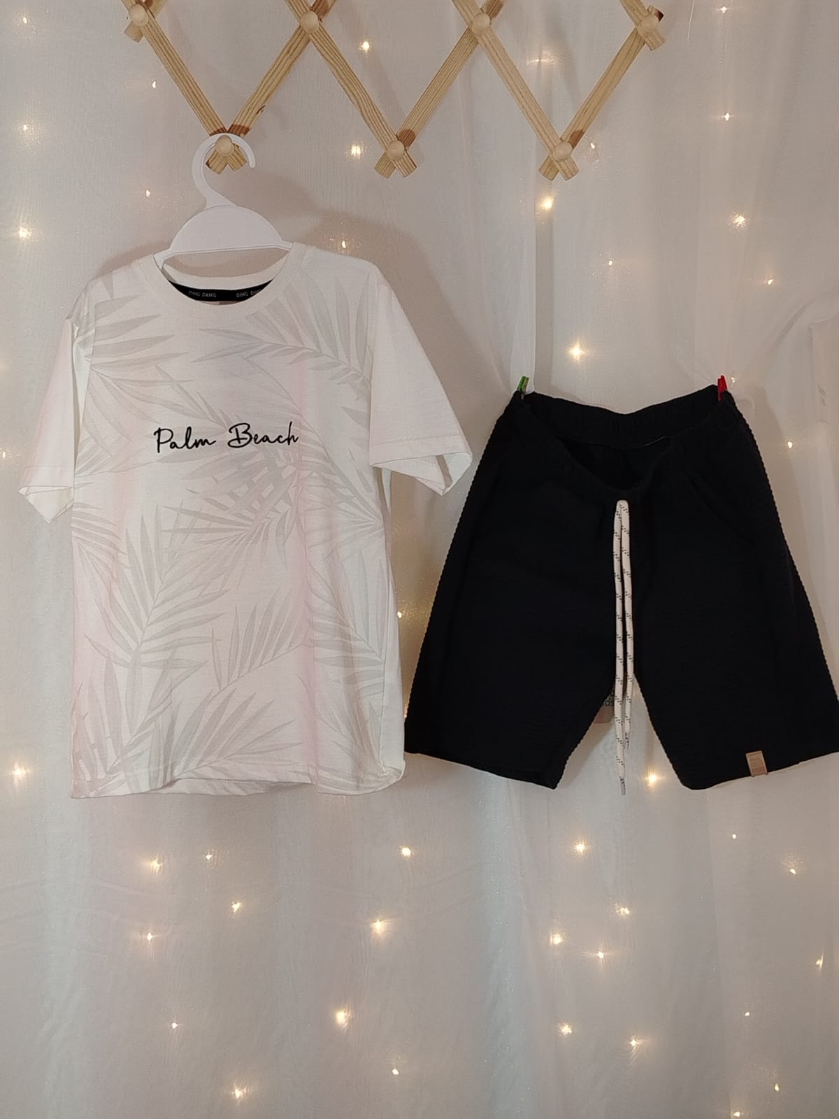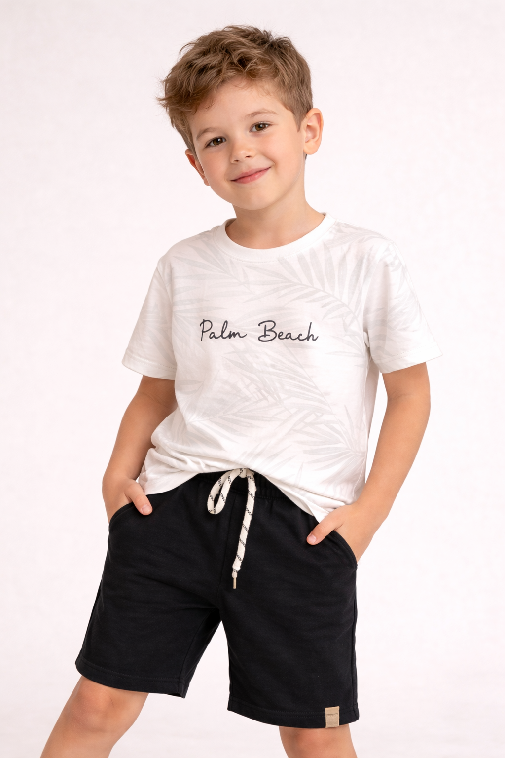 Conjunto infantil masculino composto por camiseta manga curta branca com estampa escrita “Palm Beach” e bermuda preta, confeccionados em 100% algodão, garantindo conforto, maciez e respirabilidade.