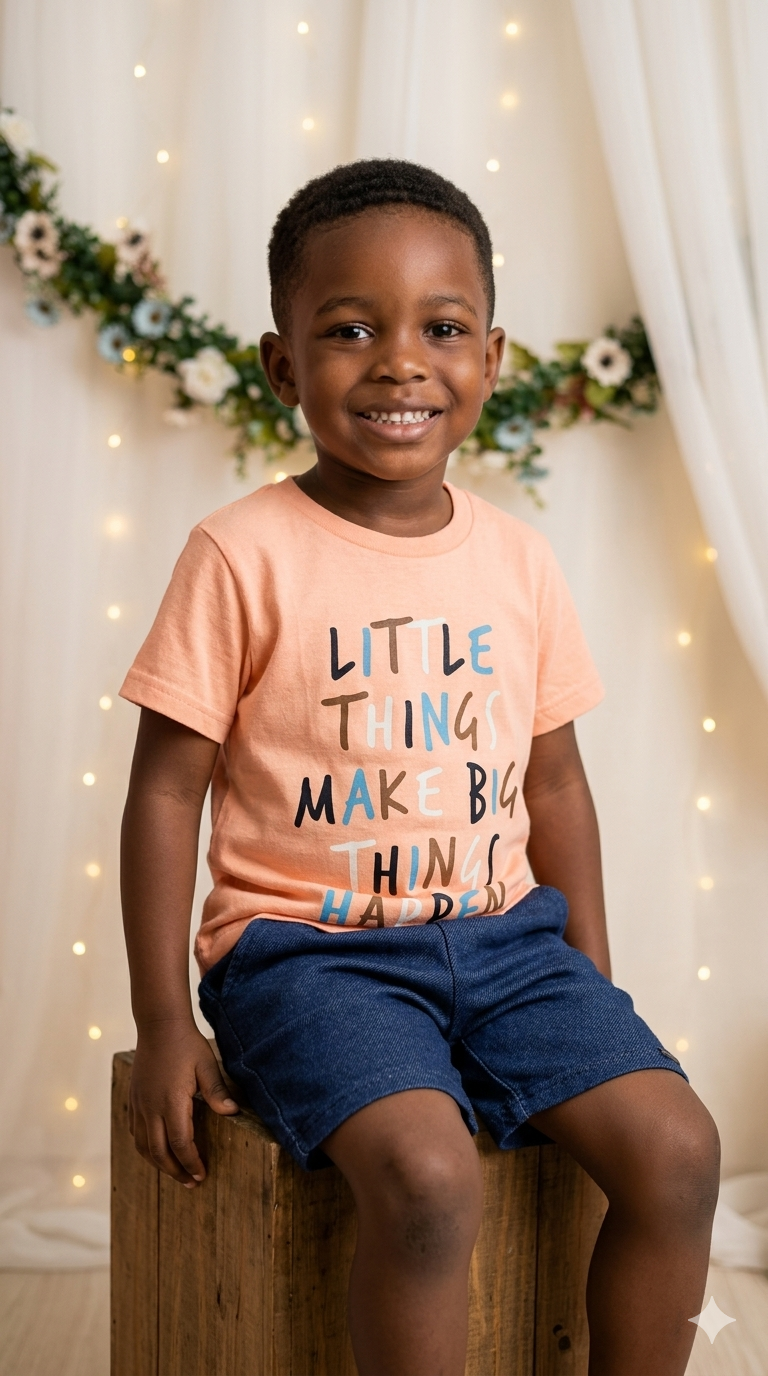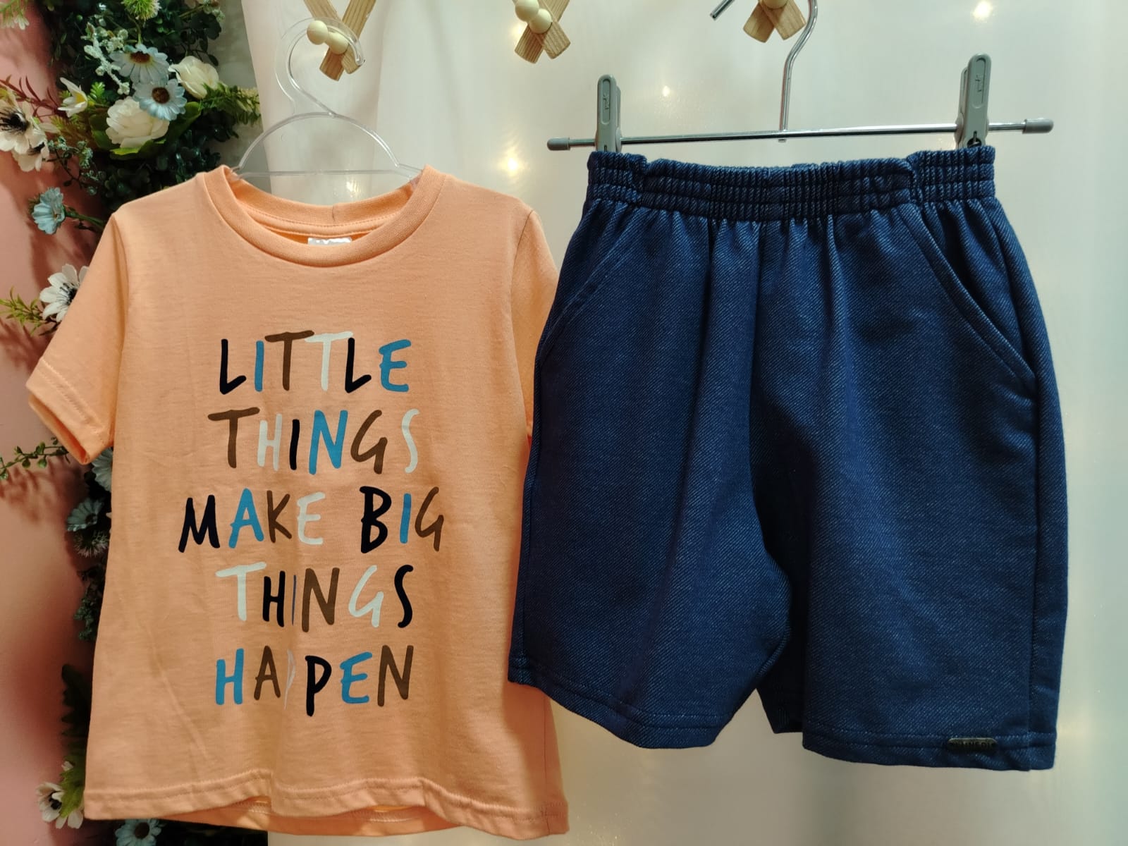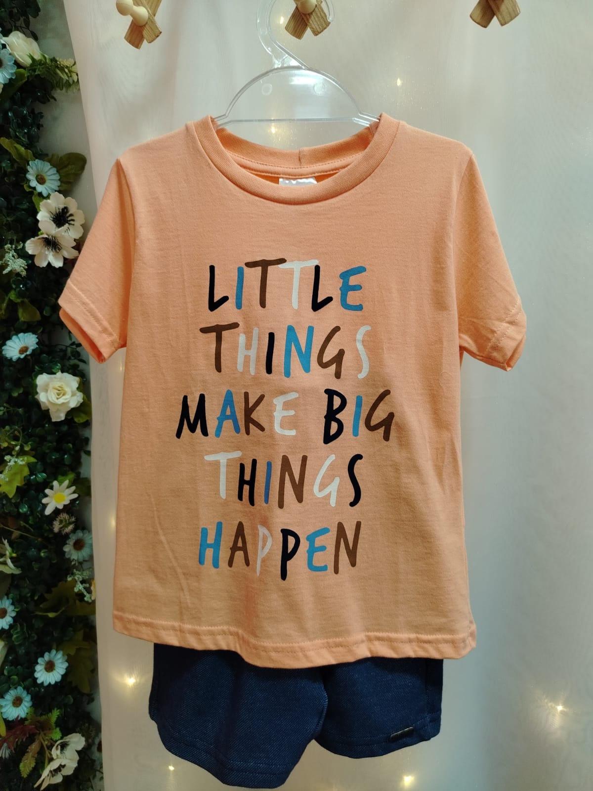 Conjunto infantil masculino composto por camiseta e bermuda, ideal para o dia a dia com muito conforto e estilo. A camiseta é confeccionada em 100% algodão, na cor laranja, com estampa frontal escrita “Little Things Make Big Things Happen”, trazendo um visual moderno e inspirador. Possui gola redonda e modelagem confortável.